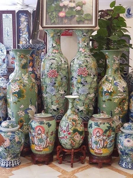 Bộ lộc Bình Bát Tràng tại cửa hàng Không Gian Gốm, mẫu lộc bình vẽ cảnh sắc sơn thủy đình chùa men rạn đẹp tinh xảo cao 1,6 m