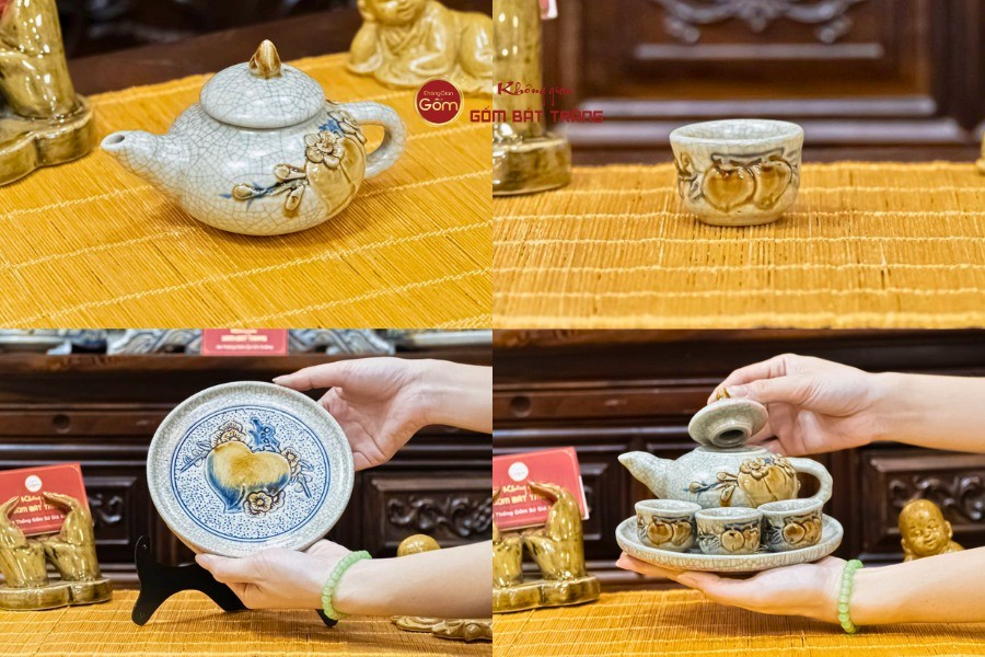 Bộ ấm chén thờ Bát Tràng thường gồm một ấm trà nhỏ và các chén đồng bộ, được chế tác với kích thước vừa phải, cân đối để phù hợp với không gian bàn thờ. Trà hoặc nước được rót vào ấm, sau đó chia đều ra các chén, tượng trưng cho sự đầy đủ, trọn vẹn và sự sẻ chia phúc lộc. Trong nhiều gia đình, việc dâng trà lên bàn thờ vào các dịp lễ Tết, giỗ chạp hay ngày rằm, mùng một đã trở thành một nét sinh hoạt tâm linh quen thuộc.