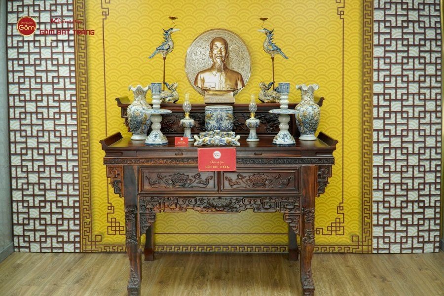Riêng không gian thờ Bác Hồ, đồ thờ men rạn tại Không Gian Gốm Bát Tràng thường được thiết kế trang nhã, cân đối, tránh sự cầu kỳ quá mức. Các vật phẩm như bát hương, lọ hoa, mâm bồng men rạn mang sắc thái trầm ấm giúp không gian thờ toát lên sự tôn kính và gần gũi.