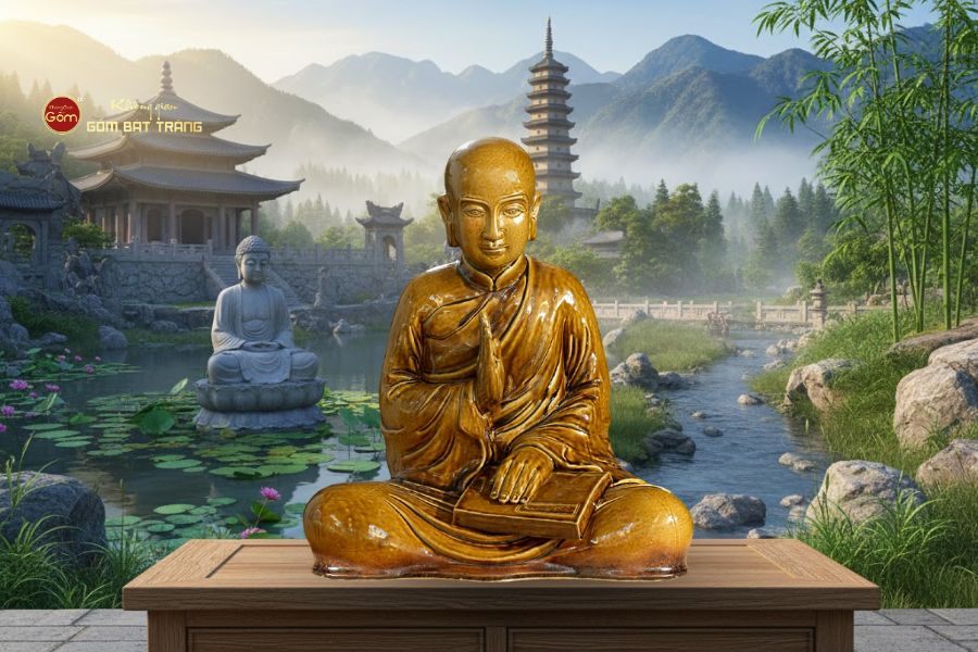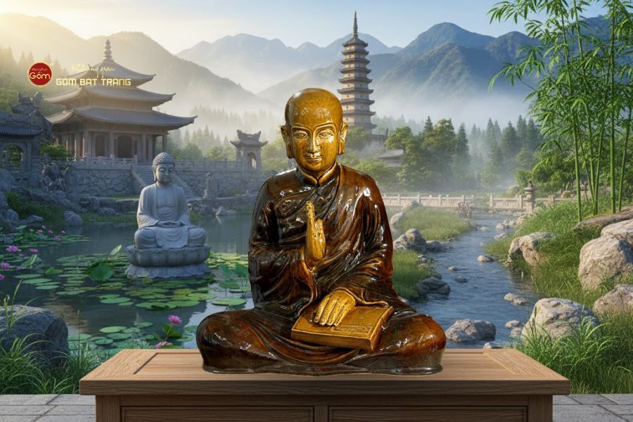 Tượng Thiền Tổ Khương Tăng Hội của Không Gian Gốm không chỉ là tác phẩm nghệ thuật mà còn là pháp khí mang năng lượng thanh tịnh, thích hợp cho không gian thờ tự, thiền đường hay trưng bày sưu tầm.