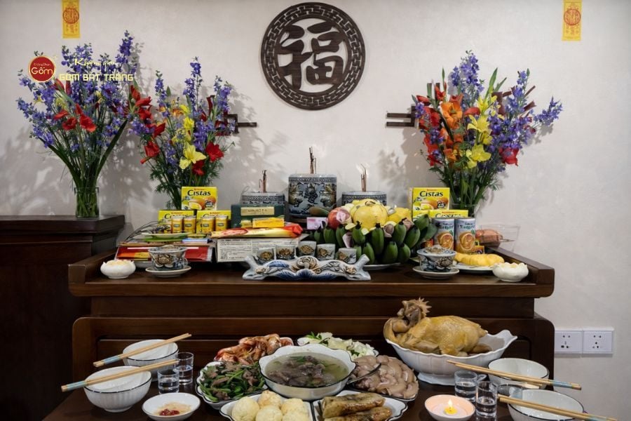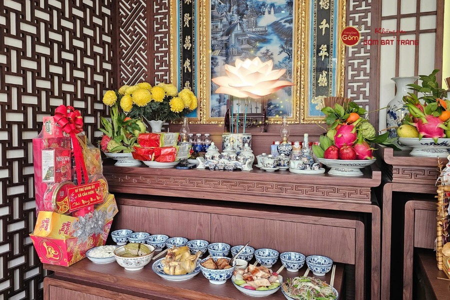 Ngoài ra, gia chủ nên chuẩn bị đầy đủ các vật phẩm thờ cúng như bát hương, đèn thờ, lọ hoa, mâm bồng, kỷ chén… để không gian thờ tự được trang nghiêm và ấm cúng. Hoa và trái cây chuẩn bị cho mâm cúng nên dùng thật và còn tươi để thể hiện thành ý với bề trên. Tránh dùng trái cây và hoa giả khiến cho mâm cúng kém long trọng.