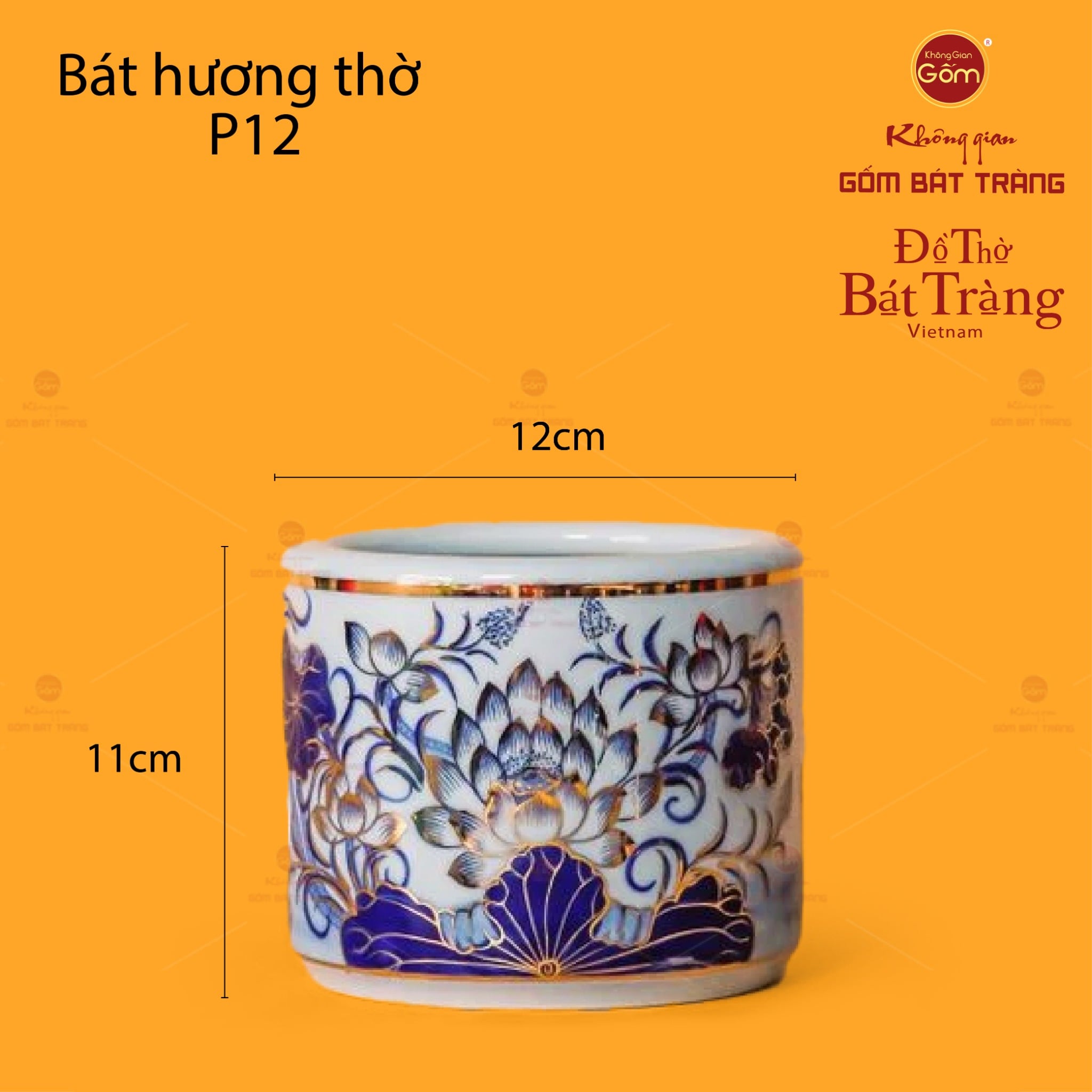 Bát hương men lam vẽ vàng họa tiết hoa sen có nhiều kích thước đa dạng phù hợp với mọi không gian thờ cúng từ bàn thờ gia tiên, bàn thờ Phật đến bàn thờ Thần Tài – Thổ Địa. Sản phẩm được nung ở nhiệt độ cao trên 1300°C, đảm bảo độ bền chắc, không nứt vỡ, không thấm nước.