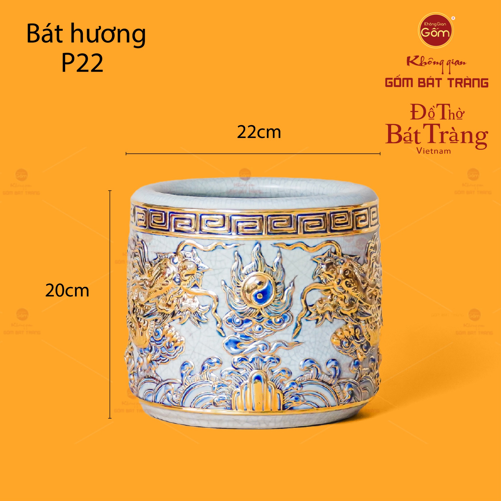 Điểm nhấn đặc biệt của bát hương này là họa tiết Song Long Chầu Nguyệt được đắp nổi tinh xảo, kết hợp cùng kỹ thuật vẽ vàng thủ công trên nền men rạn. Hình ảnh hai con rồng uy nghiêm, mạnh mẽ đối xứng hai bên, hướng về viên ngọc (nguyệt) ở chính giữa, thể hiện sự cân bằng, hội tụ linh khí và quyền lực. Các chi tiết vảy rồng, sóng nước, mây trời đều được nghệ nhân chăm chút tỉ mỉ, kết hợp hài hòa giữa sắc xanh lam, trắng ngà của men rạn và ánh vàng lấp lánh, tạo nên vẻ đẹp vừa truyền thống vừa hiện đại, vô cùng sang trọng và đẳng cấp.