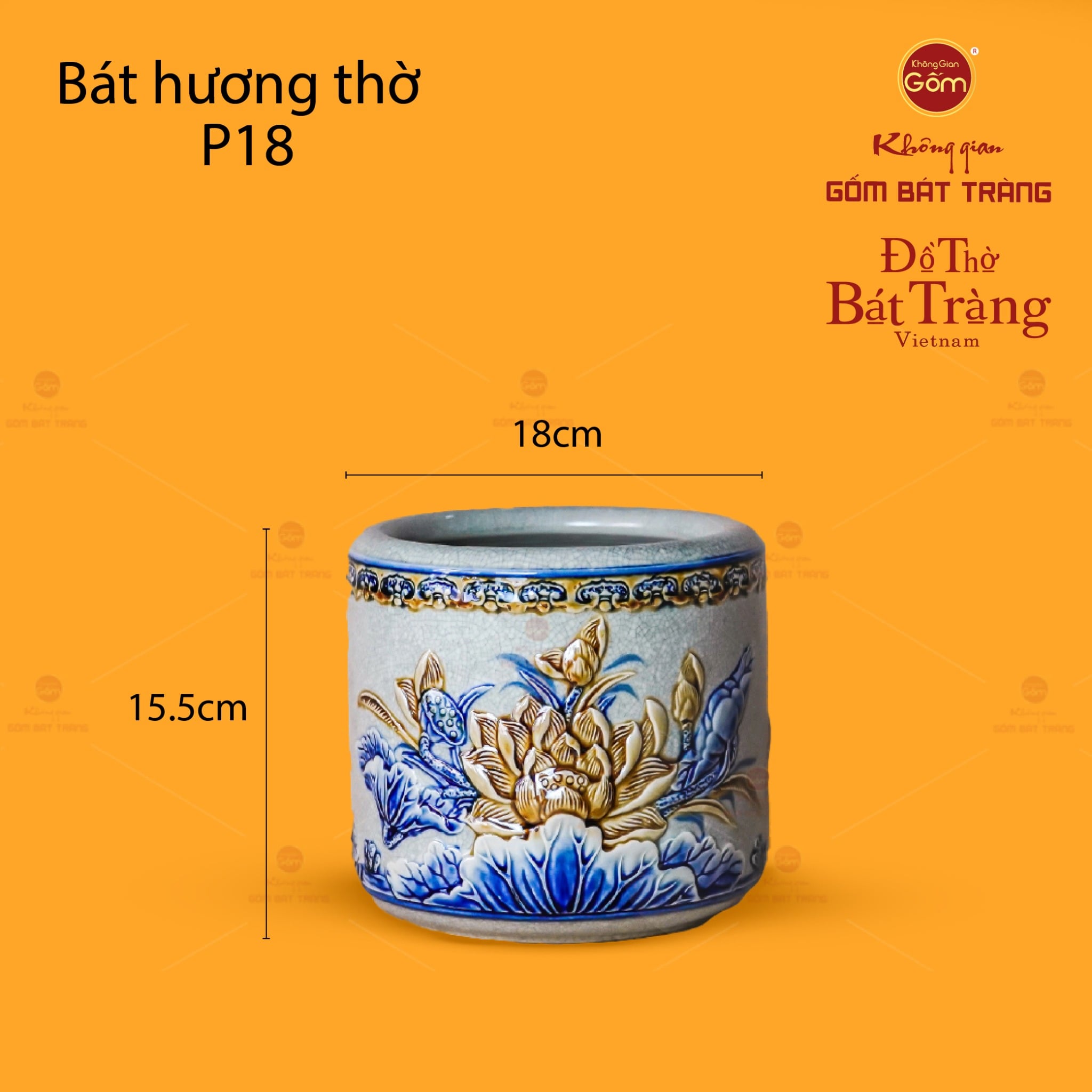 Về thiết kế họa tiết, bát hương nổi bật với hình tượng Hoa Sen được đắp nổi hoàn toàn thủ công. Những cánh sen mềm mại, thanh khiết đang bung nở giữa làn nước, kết hợp với các chi tiết lá sen, nụ sen và đôi chim nhỏ (hoặc búp sen) đang bay lượn xung quanh, tạo nên một bức tranh thiên nhiên tĩnh lặng nhưng đầy sức sống. Toàn bộ họa tiết hoa sen và các chi tiết phụ trợ được đắp nổi, tạo chiều sâu và sự sống động, như thổi hồn vào từng cánh hoa, từng chiếc lá. Sự phối màu giữa nền men rạn trắng ngà và sắc xanh lam đặc trưng của nước, lá sen, cùng tông màu vàng kem của hoa sen, tạo nên một tổng thể hài hòa, trang nghiêm và mang đậm nét văn hóa thờ cúng truyền thống Việt. Đường viền miệng bát hương thường được trang trí bằng các hoa văn đối xứng hoặc vân mây, tăng thêm vẻ trang nhã.