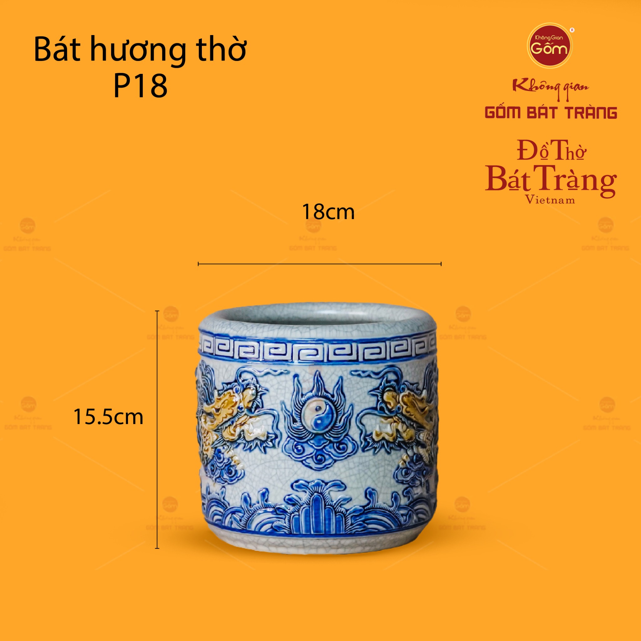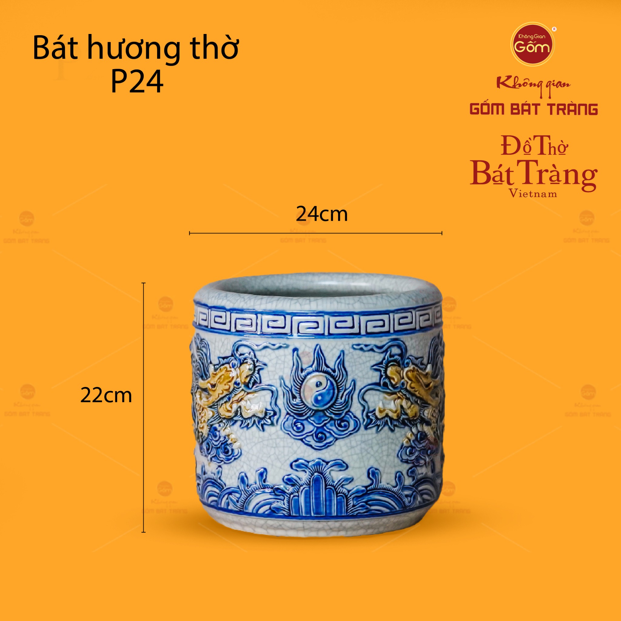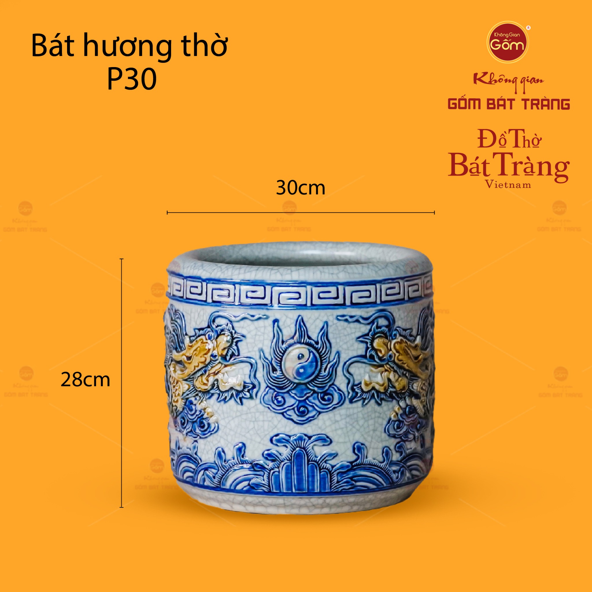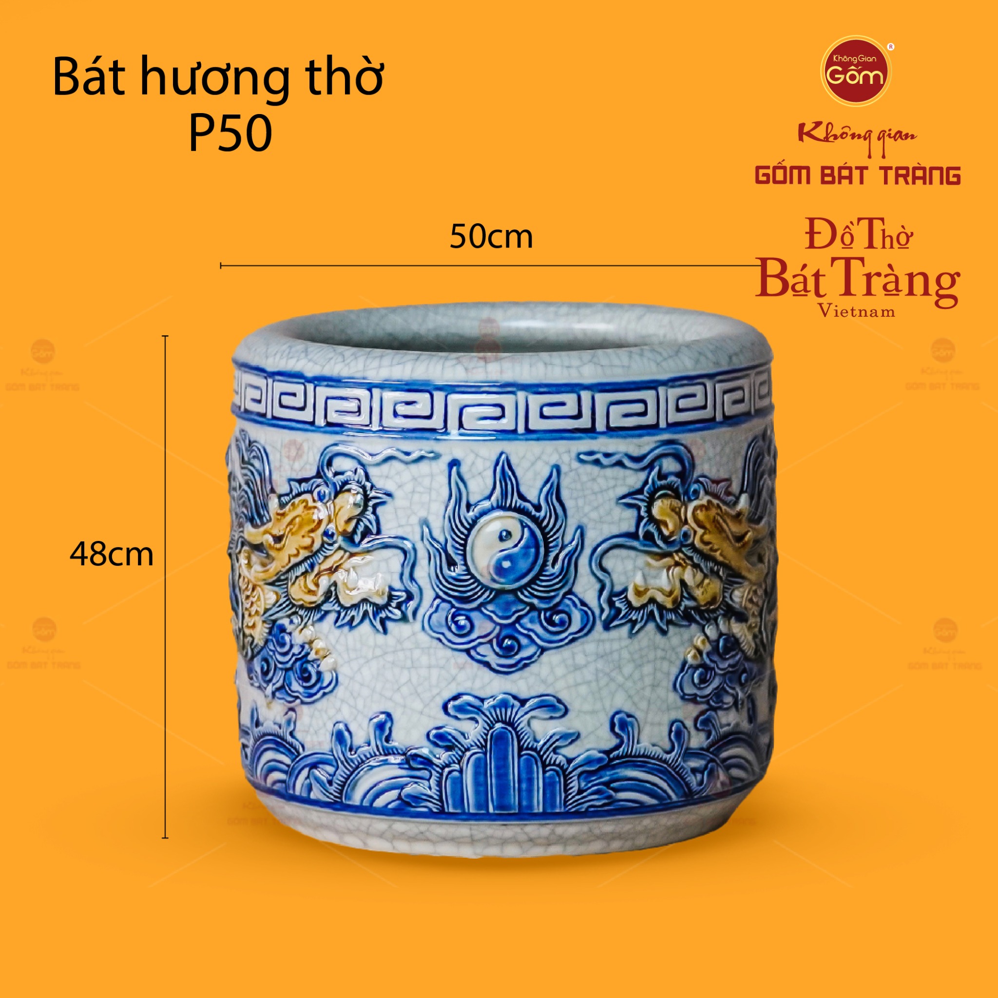 Về thiết kế họa tiết, bát hương nổi bật với hình tượng Song Long Chầu Nguyệt được đắp nổi hoàn toàn thủ công. Đôi rồng uy nghi, mạnh mẽ với những đường nét uốn lượn tinh xảo, đang hướng về biểu tượng Thái Cực (âm dương) tượng trưng cho mặt trăng, đặt ở vị trí trung tâm. Toàn bộ họa tiết rồng và biểu tượng Thái Cực được đắp nổi, tạo chiều sâu và sự sống động, như thể đôi rồng đang hiện hữu và bảo vệ không gian. Các chi tiết khác như vân mây, sóng nước ở chân bát hương được vẽ tay tỉ mỉ, làm nền cho hình ảnh rồng thêm phần nổi bật. Sự phối màu giữa nền men rạn trắng ngà và sắc xanh lam đặc trưng của rồng, mây nước, tạo nên một tổng thể hài hòa, trang nghiêm và mang đậm nét văn hóa thờ cúng truyền thống Việt.