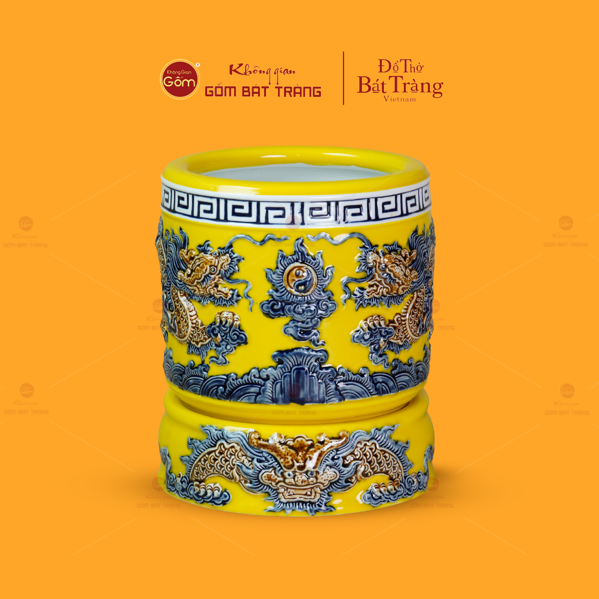 Bát Hương Thờ Men Vàng Họa Tiết Song Long Chầu Nguyệt