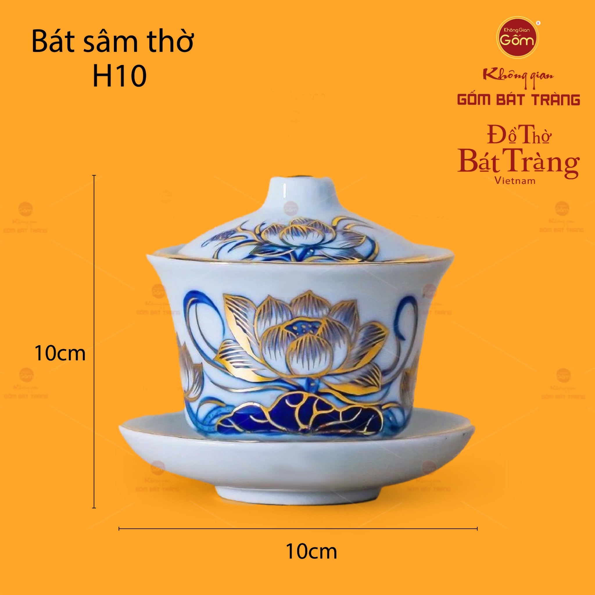 Bát Sâm Men Lam Vẽ Vàng Họa Tiết Hoa Sen là dòng sản phẩm gốm thờ cao cấp của làng gốm Bát Tràng, hội tụ cả giá trị nghệ thuật và ý nghĩa tâm linh sâu sắc. Được chế tác tỉ mỉ bằng phương pháp thủ công, bát sâm nổi bật với lớp men lam cổ điển, kết hợp kỹ thuật vẽ vàng tinh xảo và họa tiết hoa sen thanh tịnh, biểu trưng cho sự thuần khiết, giác ngộ và lòng thành tâm trong tín ngưỡng Phật giáo cũng như thờ tự gia tiên. Sản phẩm không chỉ là vật dụng trên bàn thờ mà còn là tác phẩm nghệ thuật gốm sứ mang đậm tinh thần Á Đông, thích hợp cho mọi không gian thờ cúng từ gia đình đến đình, chùa, điện thờ.