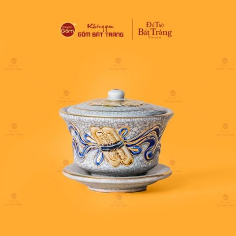Điểm nhấn đặc biệt là sắc vàng ánh kim, rực rỡ mà không chói lóa, nổi bật trên nền men rạn với tông trắng ngà thanh lịch. Sự kết hợp này hòa quyện tuyệt vời cùng những họa tiết mây nước uốn lượn mềm mại và hoa văn cổ điển tinh xảo trải dài quanh thân bát, tạo nên một chỉnh thể hài hòa, toát lên vẻ đẹp vừa trang nhã, vừa uy nghiêm. Phần miệng bát và nắp đậy còn được tinh tế tô điểm bằng những đường viền cổ điển mượt mà, không chỉ gia tăng giá trị thẩm mỹ mà còn hình thành nên một tác phẩm nghệ thuật thực sự hoàn hảo, hội tụ cả công năng lẫn nét đẹp văn hóa truyền thống.