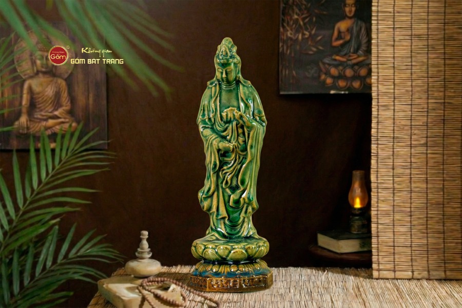 Màu sắc Men Ngọc (Celadon) huyền bí: Điểm nhấn lớn nhất chính là lớp men ngọc cổ kính. Sắc xanh sâu thẳm, bóng bẩy nhưng vẫn giữ được độ trầm mặc, tạo cảm giác dịu mắt và thanh tịnh. Các đường rạn tự nhiên dưới lớp men càng làm tăng thêm vẻ hoài cổ và giá trị nghệ thuật cho bộ tượng.
