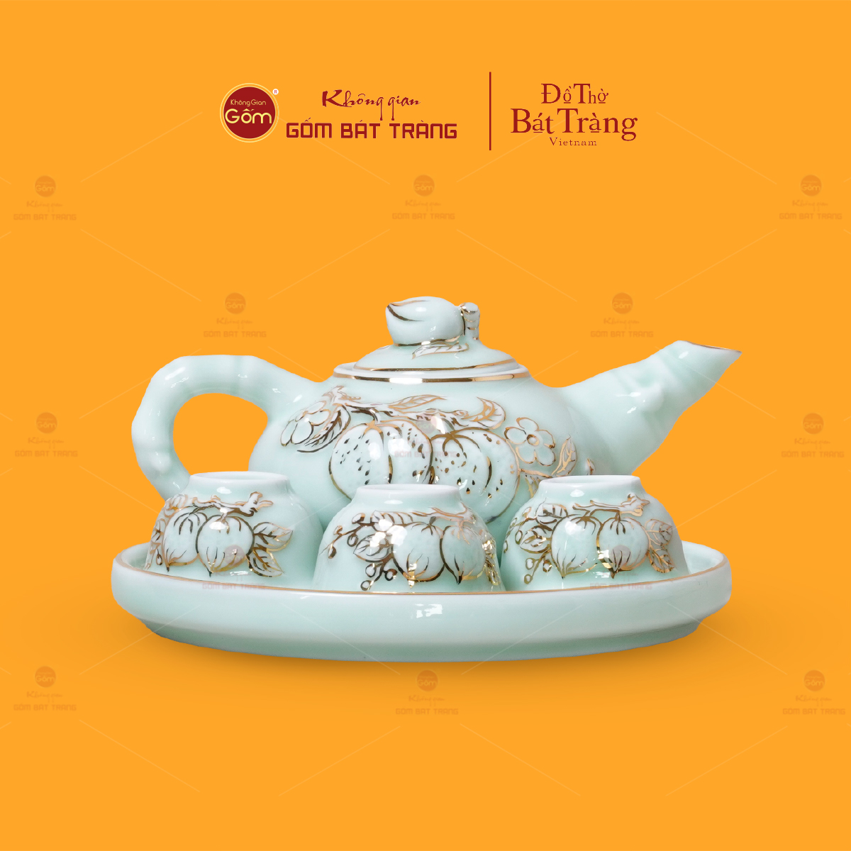 Bộ ấm chén được tạo ra từ nguồn đất sét tinh tuyển, một đặc sản của vùng đất Bát Tràng, nổi tiếng với độ dẻo và khả năng chịu nhiệt cao. Trải qua quá trình nhào luyện công phu, loại bỏ tạp chất, đất sét trở nên mịn màng, tạo nền tảng vững chắc cho những đường nét tinh xảo của sản phẩm. Đồ thờ men ngọc hoàng tộc vẽ vàng được nung ở nhiệt độ trên 1200°C trong các lò nung truyền thống, đảm bảo độ bền cơ học cao, khả năng chịu nhiệt tốt và tuổi thọ lâu dài. Quá trình nung đặc biệt này không chỉ giúp sản phẩm cứng cáp mà còn làm cho lớp men "hoàng thổ" thêm phần sáng bóng, bền màu theo thời gian, không bị rạn nứt hay phai màu dưới tác động của môi trường.