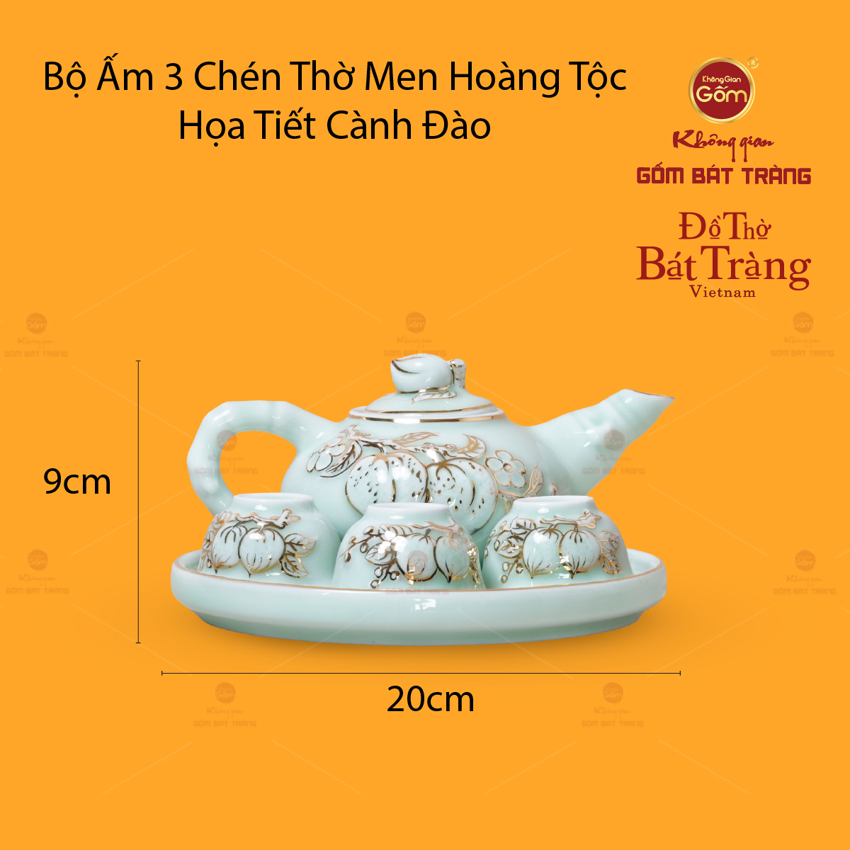 BỘ ẤM 3 CHÉN THỜ MEN NGỌC HOÀNG TỘC CÀNH ĐÀO VẼ VÀNG
