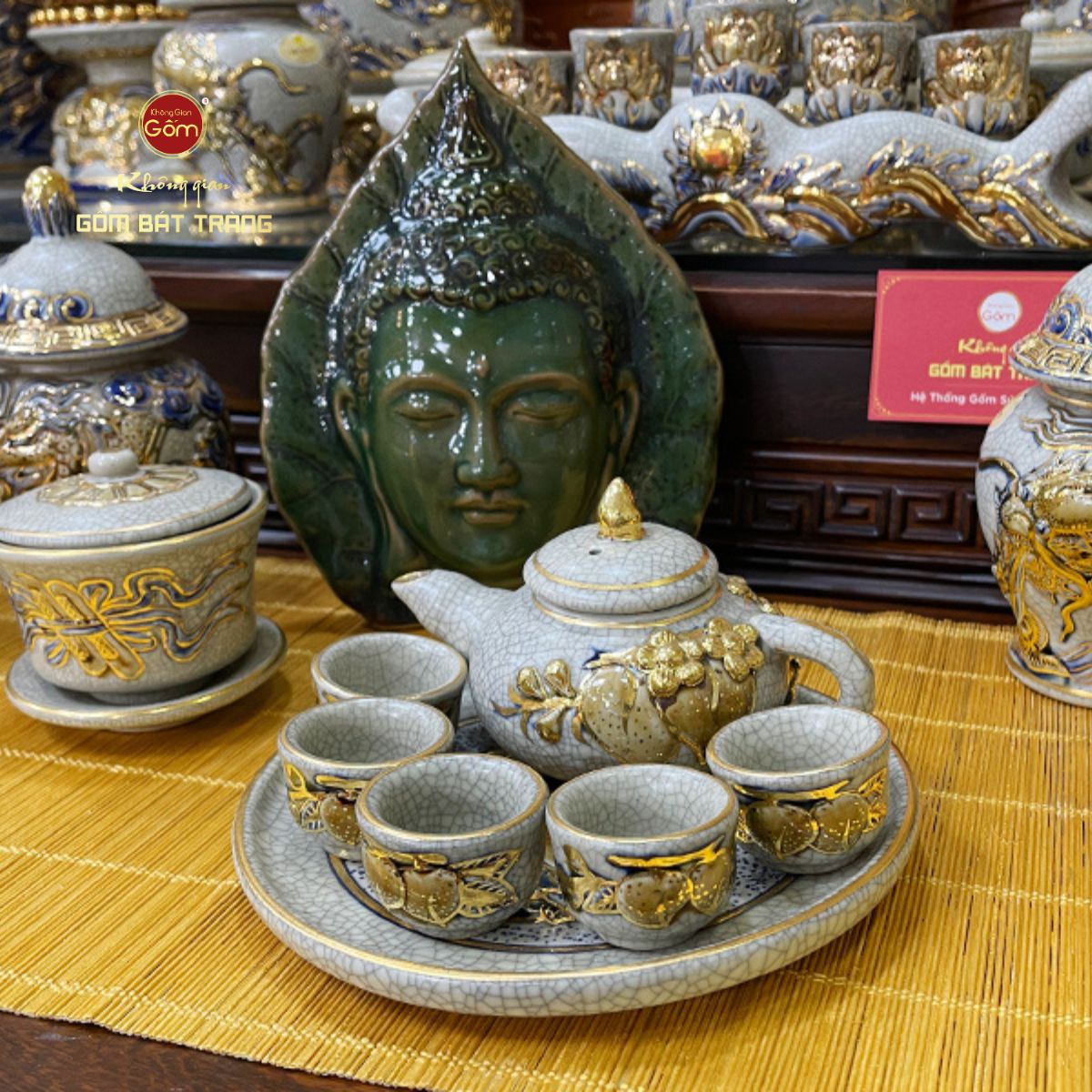 Khay tròn đồng bộ: Bộ sản phẩm đi kèm khay tròn đắp nổi men rạn – vừa để cố định các chén, vừa tạo tổng thể hài hòa, tiện lợi khi bài trí. Thiết kế này giúp bộ ấm chén không chỉ đẹp về hình thức mà còn thực sự gọn gàng, tiện dụng và chuẩn mực trong nghi thức thờ cúng.