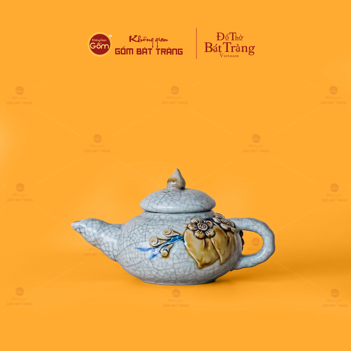 Bộ Ấm Chén Thờ Men Rạn Vẽ Vàng là một tác phẩm gốm sứ nghệ thuật đặc sắc, được tạo nên với mục đích chính là phục vụ không gian thờ cúng mang đậm nét truyền thống. Đây là một trong những sản phẩm nằm trong bộ sưu tập vật phẩm thờ linh thiêng của làng nghề gốm sứ nổi tiếng Bát Tràng. Bộ ấm chén này không chỉ thu hút ánh nhìn bởi thiết kế độc đáo được lấy cảm hứng từ kiểu dáng cổ điển mà còn bởi lớp men rạn tuyệt đẹp, hòa quyện tinh tế với những họa tiết hoa đào được vẽ vàng đầy ấn tượng trên nền chất liệu gốm sứ cao cấp. Từng chi tiết nhỏ đều được các nghệ nhân tài hoa chăm chút kỹ lưỡng, thể hiện cả sự khéo léo lẫn tâm huyết trong việc bảo tồn và phát huy tinh hoa gốm sứ Việt Nam. Đồng thời, sản phẩm còn phản ánh sâu sắc nét văn hóa uống trà, biểu trưng cho sự kính trọng và lòng biết ơn đối với tổ tiên trong tín ngưỡng thờ cúng của người Việt Nam.