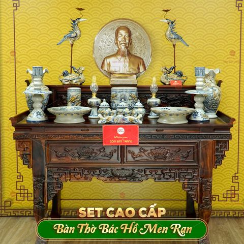 Đặc biệt, Set Cao Cấp được thiết kế phù hợp với nhiều kích thước bàn thờ: 1m27, 1m54 và 2m, giúp gia chủ dễ dàng lựa chọn theo không gian đặt thờ. Bộ sản phẩm không bao gồm tượng Bác, tạo điều kiện để mỗi người có thể chọn mẫu tượng phù hợp với phong thủy và diện tích phòng thờ. Từ chất liệu gốm rạn cao cấp đến đường nét tạo hình chuẩn mực, từng món đồ đều toát lên thần thái thanh tịnh, bền đẹp và sang trọng – là sự kết tinh giữa bàn tay nghệ nhân và tâm hồn người Việt hướng về Bác Hồ kính yêu.