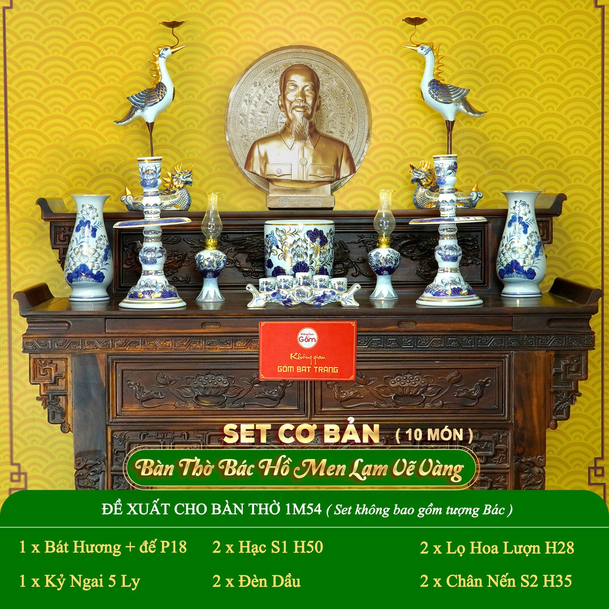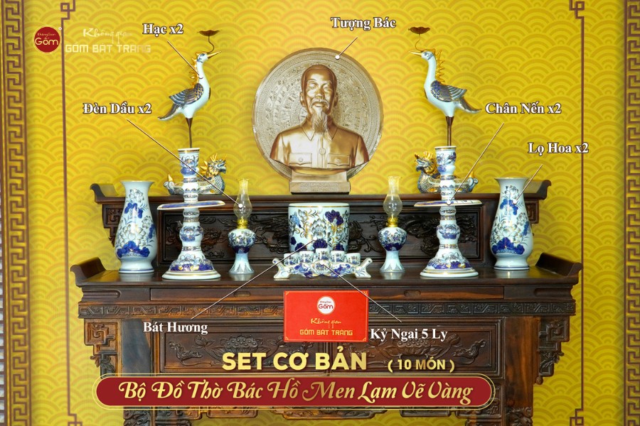 Bộ đồ thờ gồm 10 món cơ bản, được sắp đặt hài hòa, phù hợp với các kích thước bàn thờ Bác phổ biến từ 1m27 đến 2m. Bộ sản phẩm bao gồm: bát hương, kỷ ngai 5 ly, đôi hạc thờ, đôi đèn dầu, đôi lọ hoa lưỡng, cùng hai chân nến. Tất cả đều được làm từ gốm sứ cao cấp, phủ men lam rạn cổ và điểm xuyết họa tiết vẽ vàng 24K tinh xảo.