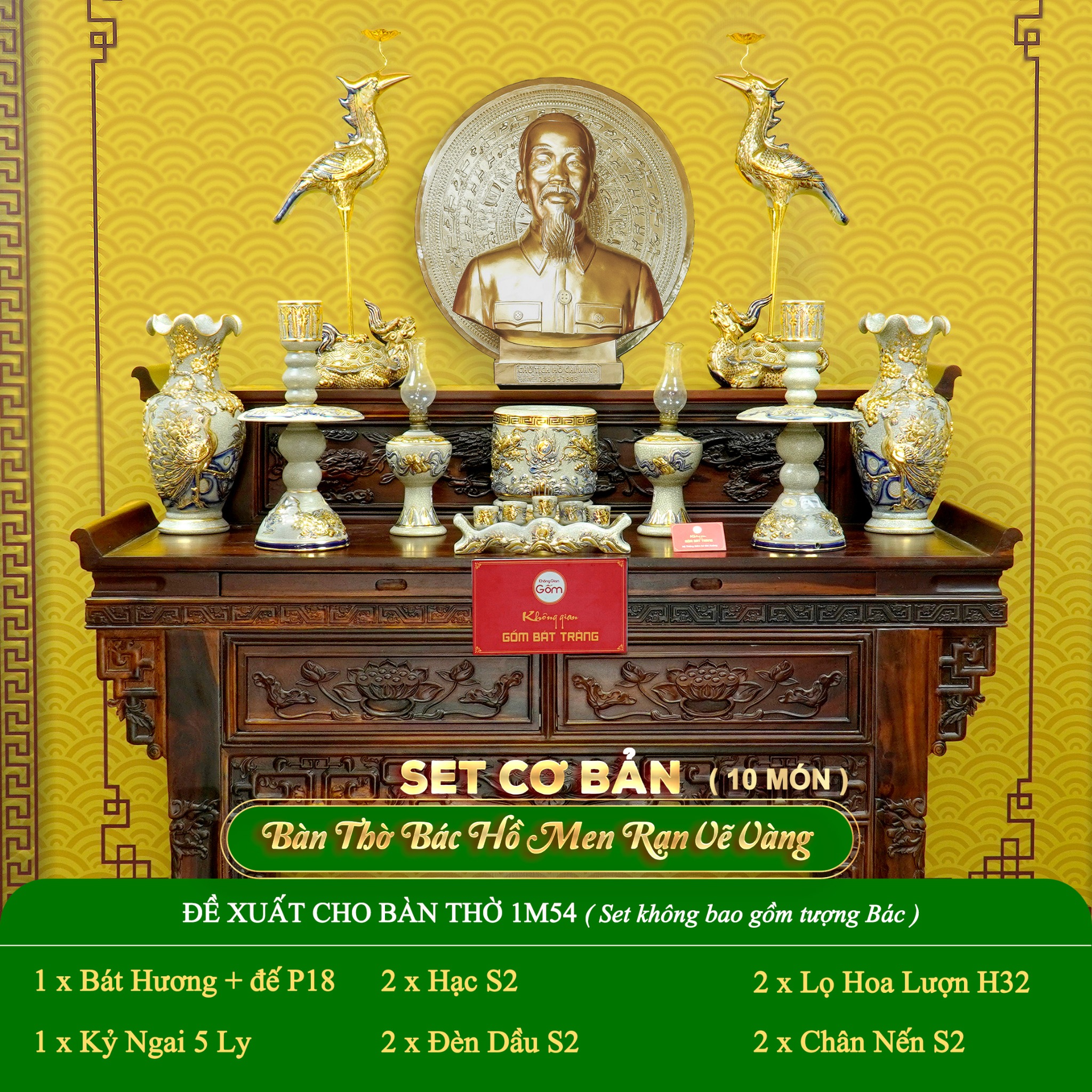 Bộ Đồ Thờ Bác Hồ (Cơ Bản 10 Món) Men Rạn Vẽ Vàng