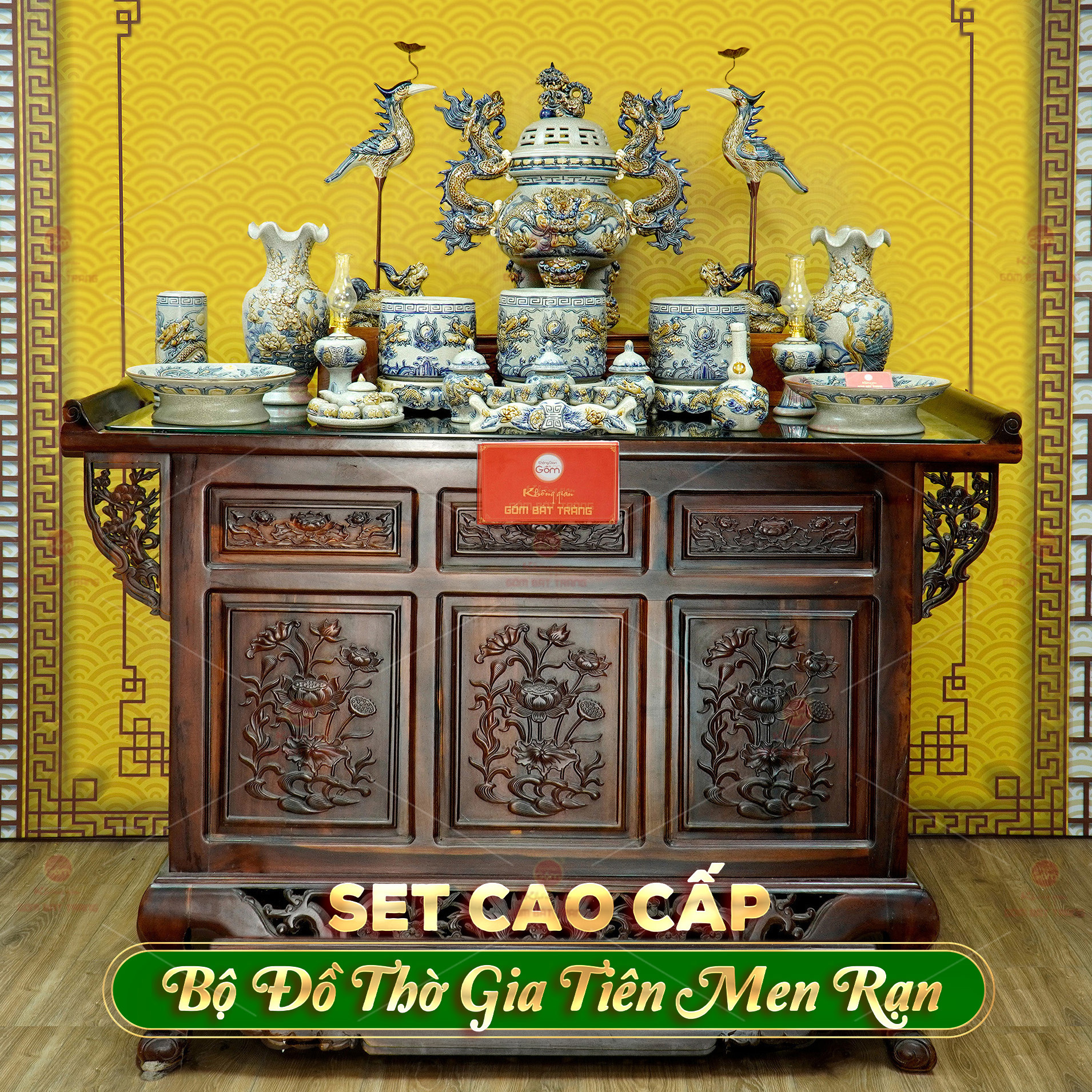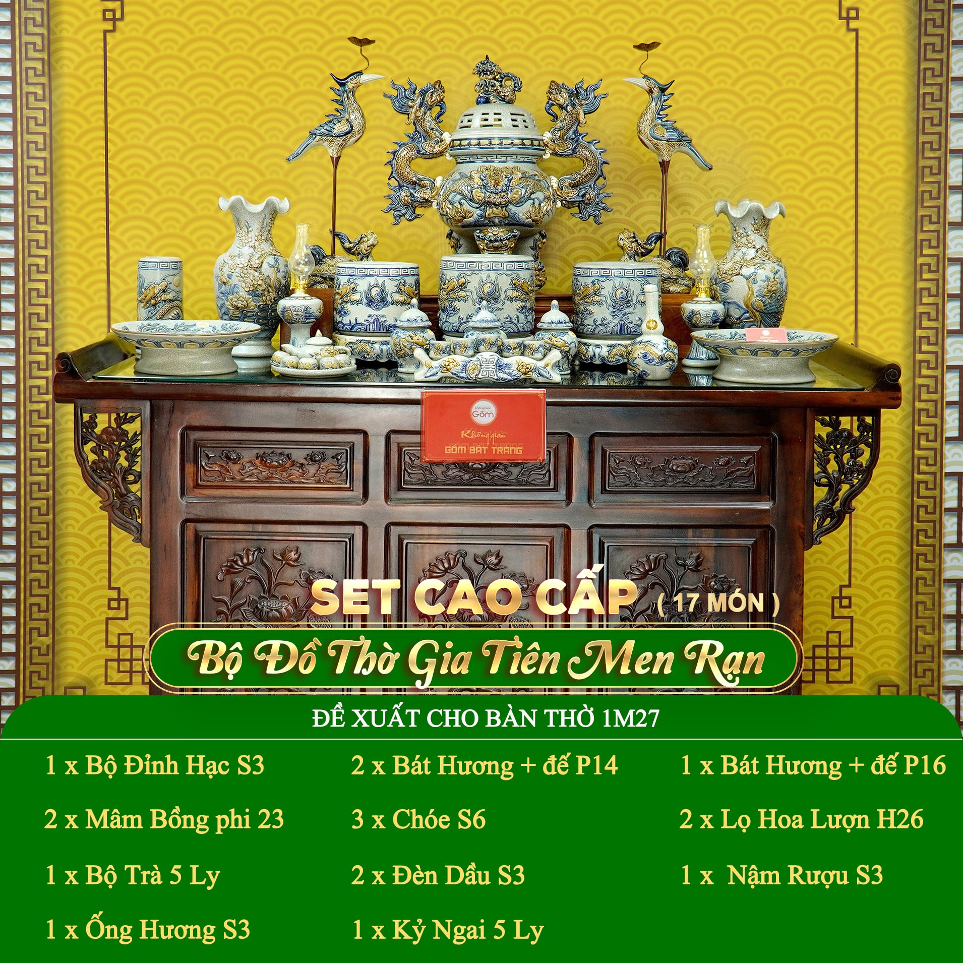 Trên nền men rạn, các họa tiết được vẽ tay thủ công với những biểu tượng truyền thống. Các món đồ được thiết kế theo tỷ lệ hài hòa, phù hợp với đa số kích thước bàn thờ gia tiên phổ biến (từ 1m27 – 1m75), đảm bảo tổng thể cân đối và tôn nghiêm.