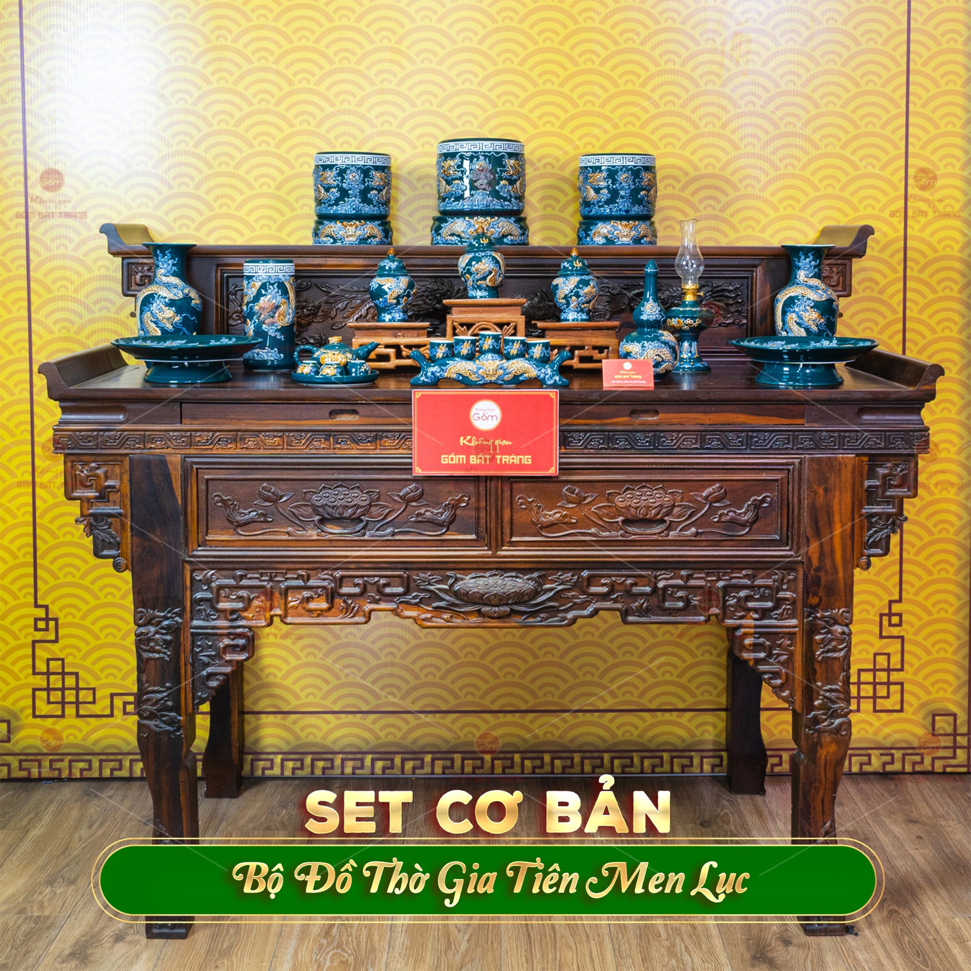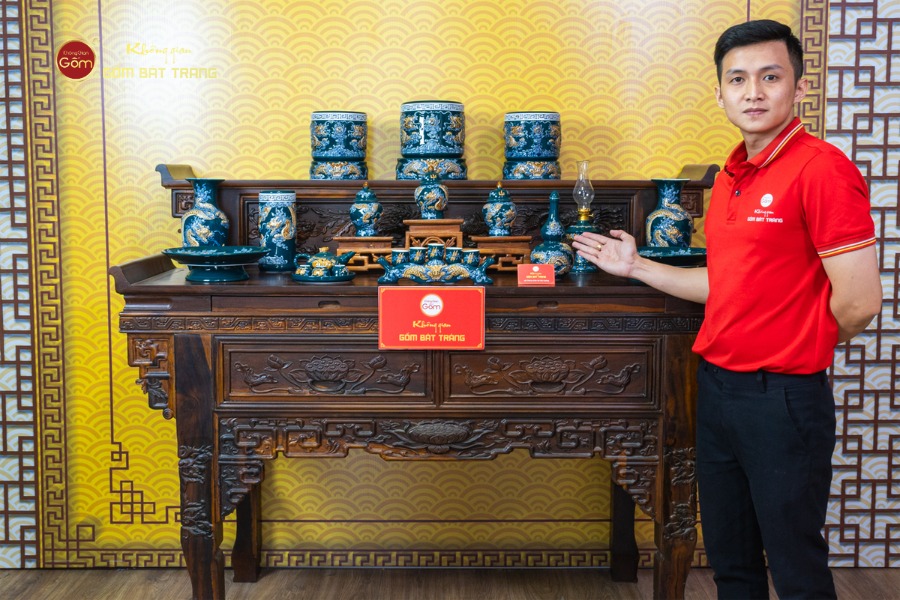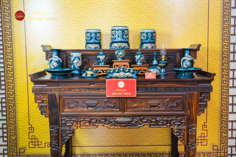 Bộ gồm mười lăm món được sắp xếp theo bố cục cân đối, đảm bảo đầy đủ các vật phẩm cần thiết trên bàn thờ gia tiên. Sự đồng bộ về sắc men và hoa văn giúp tổng thể trở nên thống nhất, tránh cảm giác rời rạc khi bài trí. Khi đặt lên bàn thờ gỗ truyền thống, men lục tạo sự hài hòa, không quá nổi bật nhưng vẫn đủ để làm sáng không gian.