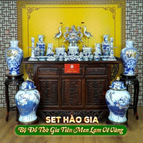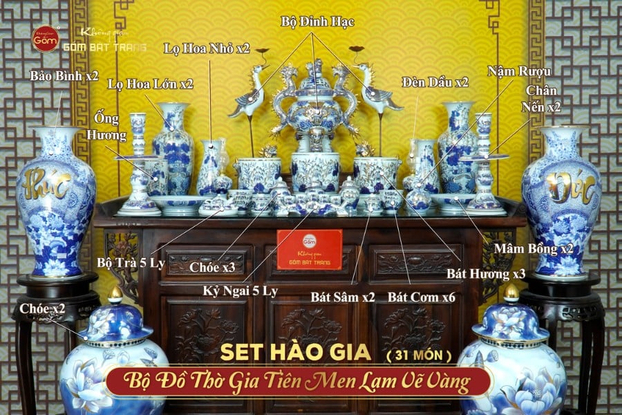 Bộ Đồ Thờ Gia Tiên (Hào Gia 31 Món) Men Lam Vẽ Vàng