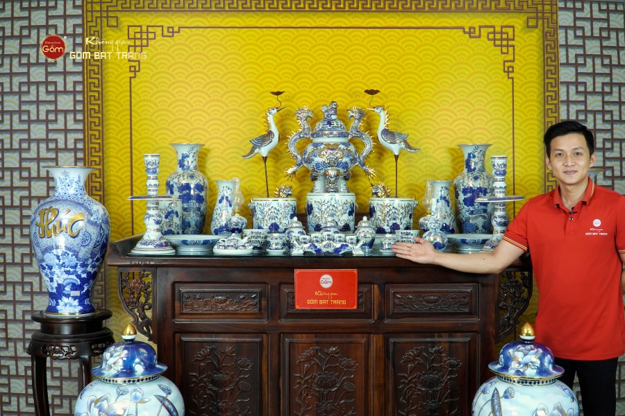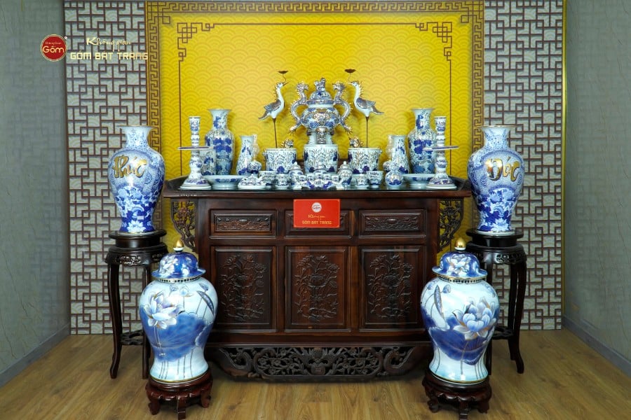 Người thợ sử dụng men lam cổ làm nền và các họa tiết truyền thống như rồng, hoa sen được vẽ thủ công, điểm thêm vàng 24k tạo điểm nhấn sang trọng, đồng thời đảm bảo đầy đủ các vật phẩm cơ bản cho bàn thờ, như bát hương, chóe, kỷ chén, mâm bồng, lọ hoa, đèn dầu và ống hương. Bộ sản phẩm mang ý nghĩa phong thủy tốt đẹp, cầu mong sự hòa hợp, an khang, thịnh vượng.