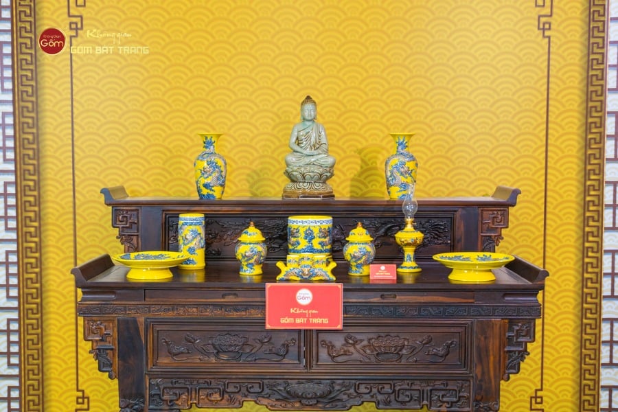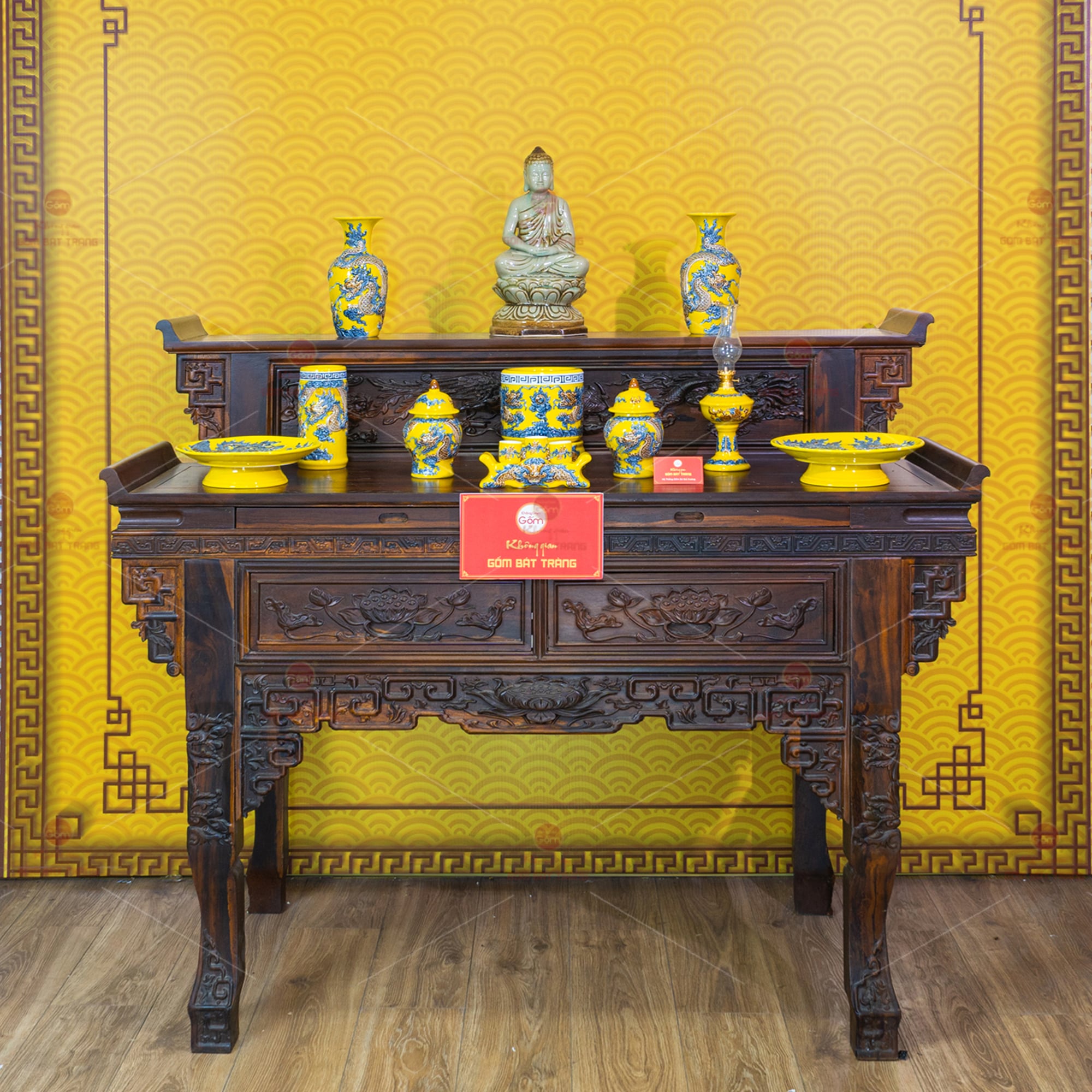 Bộ Đồ Thờ Phật (Cơ Bản 11 Món) Men Lam Nổi Vẽ Vàng