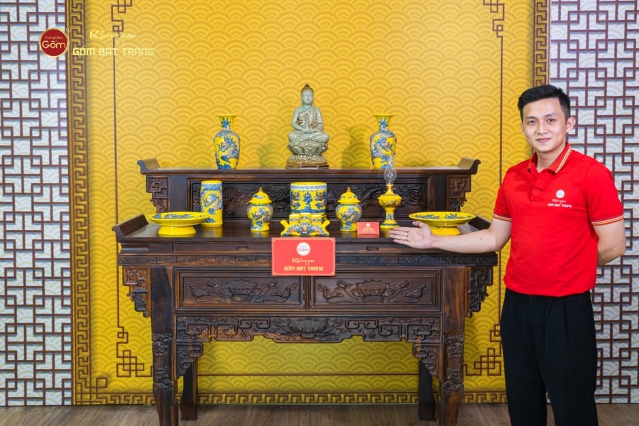 Men vàng là một trong những dòng men quý hiếm, mang ý nghĩa phong thủy tốt lành, chỉ có thể tìm thấy tại làng gốm Bát Tràng. Men đỏ rực rỡ được tạo ra nhờ kỹ thuật nung gốm đặc biệt, đòi hỏi sự kiểm soát nhiệt độ và kỹ thuật rất cao từ nghệ nhân lành nghề. Lớp men đỏ thẫm, tươi sáng, bóng mịn, láng mượt, phủ đều trên toàn bộ bề mặt sản phẩm, tạo nên vẻ đẹp rực rỡ, trang trọng mà vẫn giữ được nét đơn giản, thanh thoát đặc trưng của đồ thờ Phật. Sắc đỏ không quá chói lóa, không quá đậm, vừa phải, mang lại cảm giác ấm áp, vui tươi, hạnh phúc.