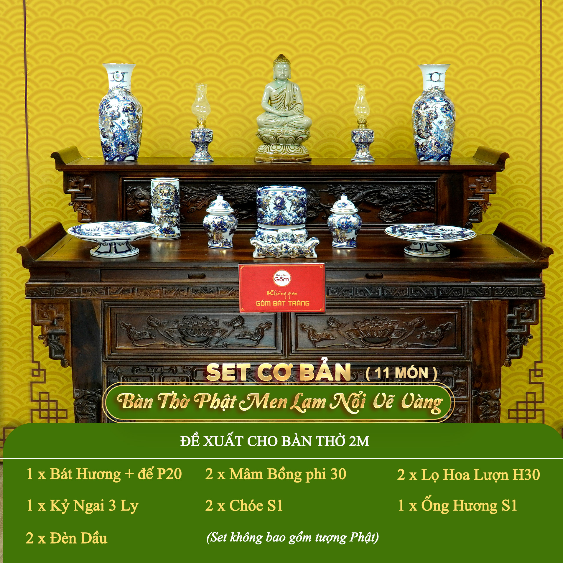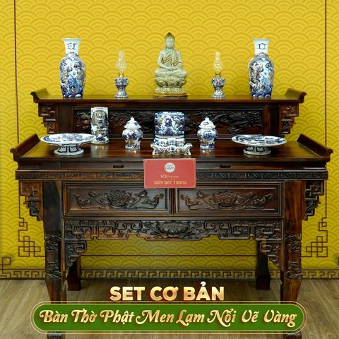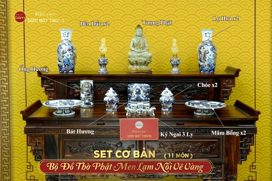 [Set Cơ Bản] Bộ Đồ Thờ Phật (Cơ Bản 11 Món) Men Lam Nổi Vẽ Vàng