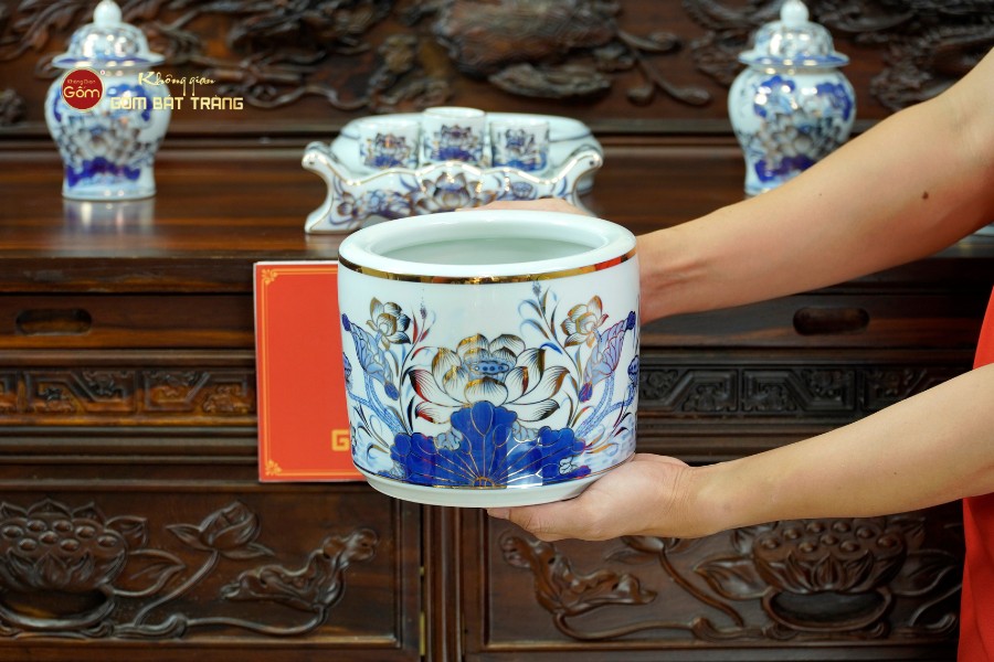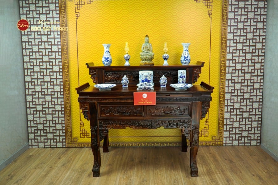 Bộ đồ thờ được chế tác từ gốm sứ Bát Tràng cao cấp, phủ lớp men lam cổ điển, màu xanh lam trầm tĩnh tượng trưng cho trí tuệ, sự thanh khiết và niềm an lạc trong tâm. Dưới đôi tay tài hoa của nghệ nhân làng nghề, từng đường nét được chạm khắc tinh xảo, từng họa tiết được vẽ tay tỉ mỉ, mang đến cảm giác hài hòa, nhẹ nhàng và sâu lắng.