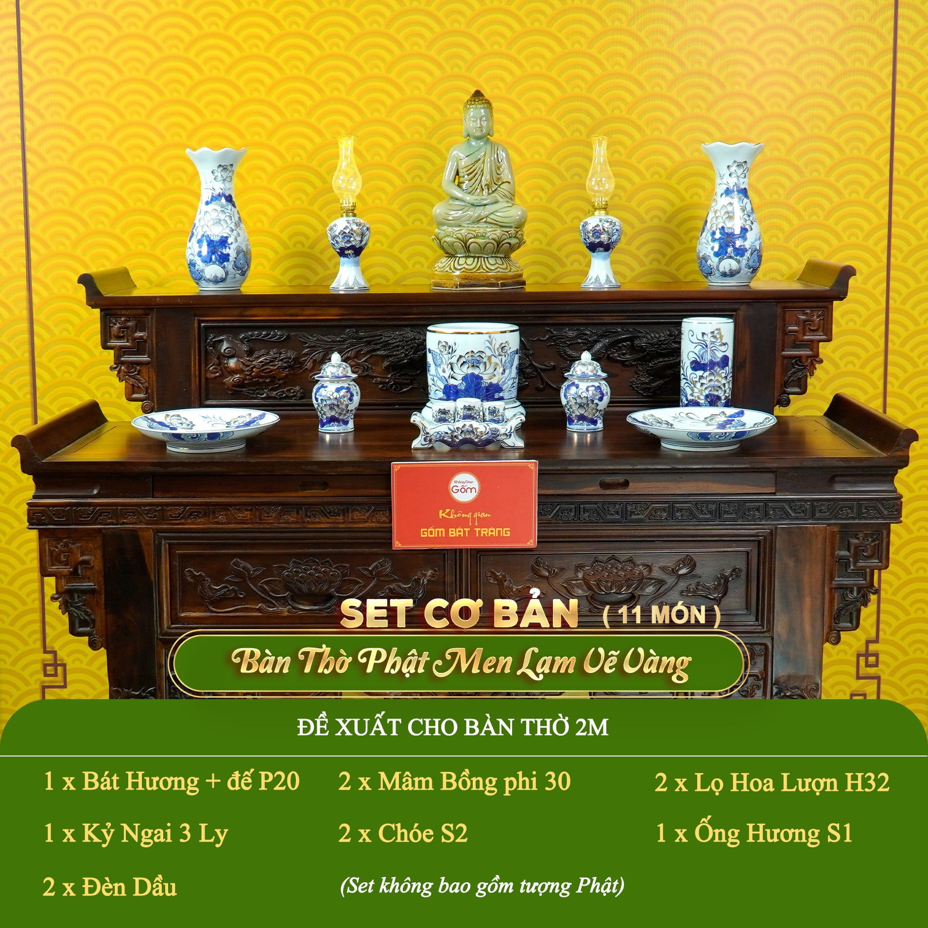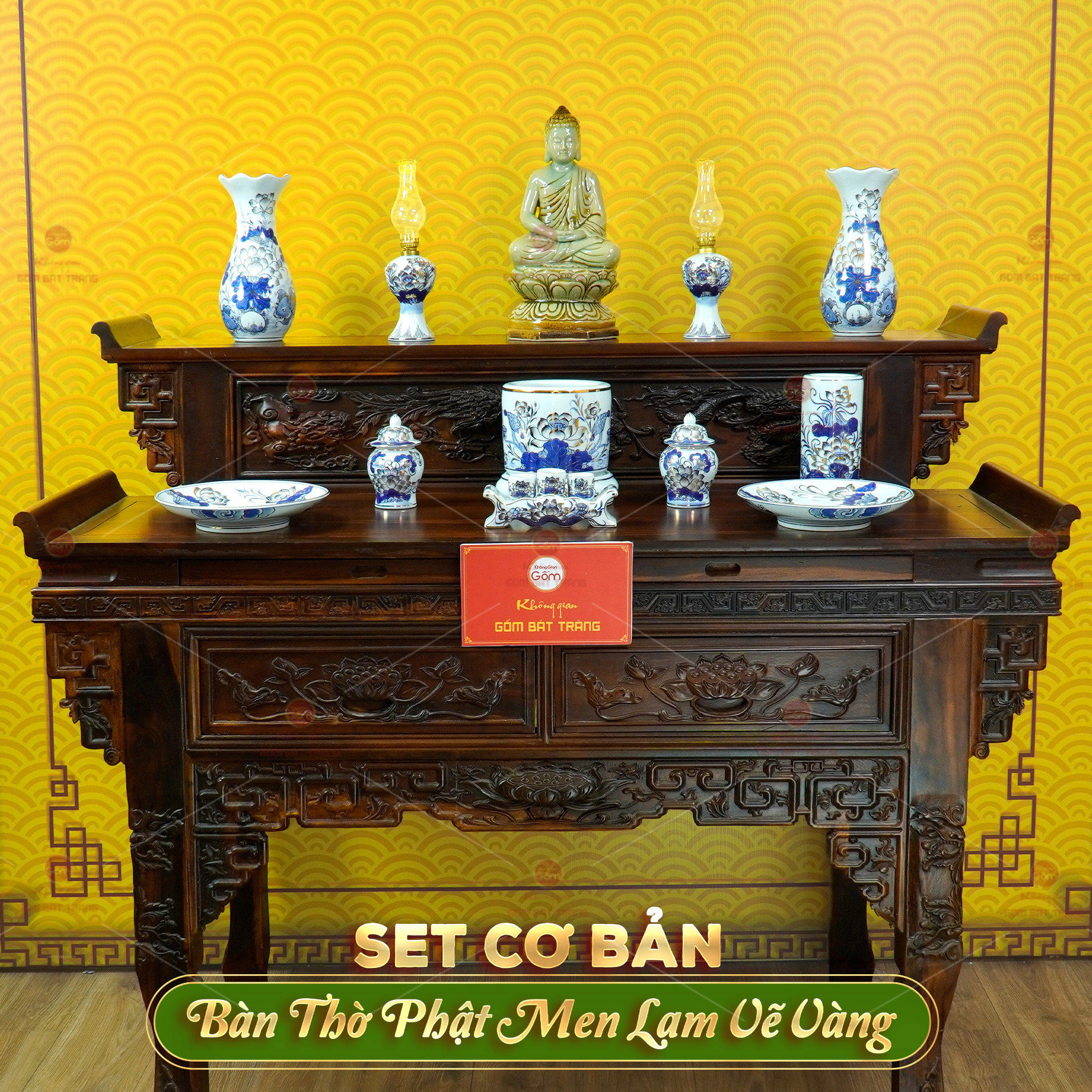 Bộ Đồ Thờ Phật (Cơ Bản 11 Món) Men Lam Vẽ Vàng