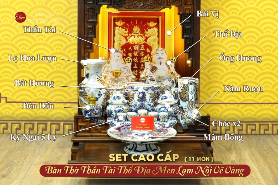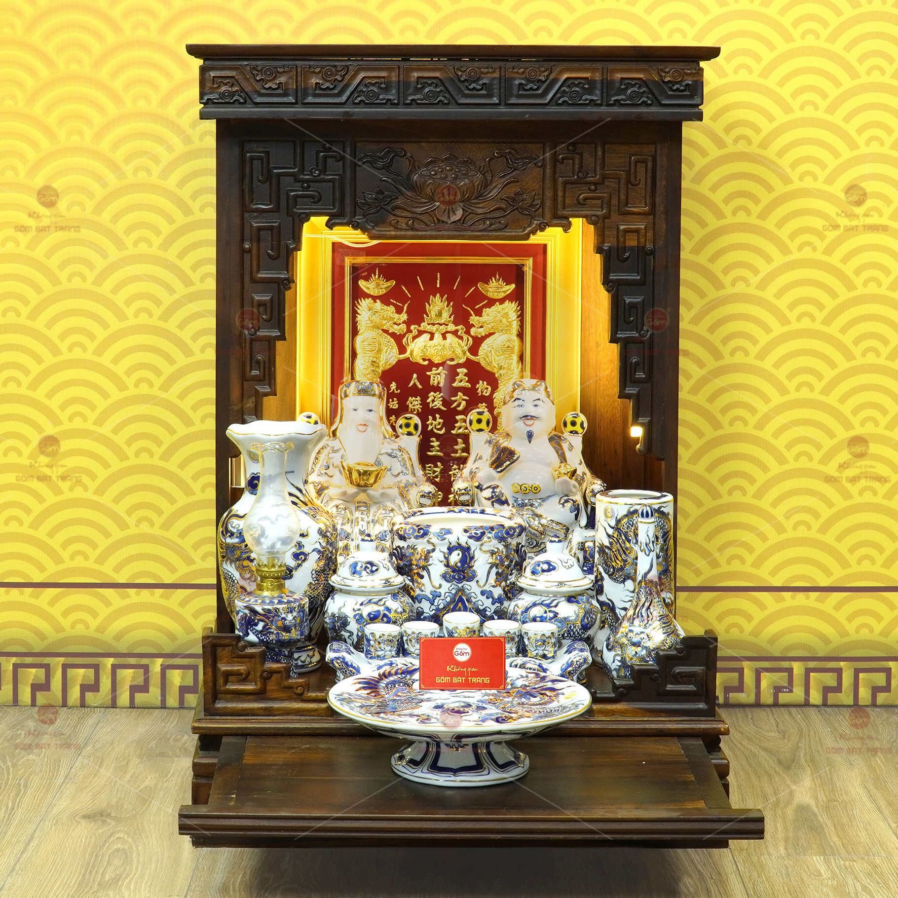 Bộ Đồ Thờ Thần Tài Thổ Địa (Cao Cấp 11 Món) Men Lam Nổi Vẽ Vàng