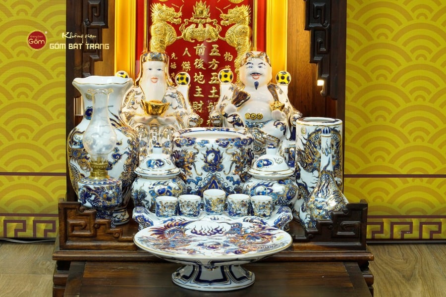 Bộ đồ thờ Thần Tài Thổ Địa Men Lam Nổi Vẽ Vàng (Set Cao Cấp 11 món) không chỉ là vật phẩm phong thủy mang lại tài lộc, mà còn là tác phẩm nghệ thuật gốm sứ tinh hoa, góp phần kiến tạo nên không gian thờ phụng linh thiêng, tôn nghiêm và đầy năng lượng thịnh vượng cho gia chủ.