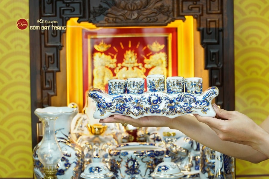 Mỗi sản phẩm được nung ở nhiệt độ trên 1.200°C, cho độ bền cao, bề mặt men trong và sâu, lớp vàng vẽ thủ công phản chiếu ánh sáng nhẹ, giúp bàn thờ Thần Tài – Thổ Địa trở nên nổi bật và tôn nghiêm hơn.