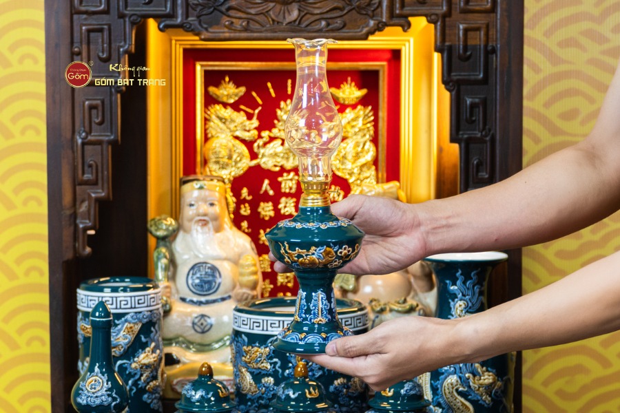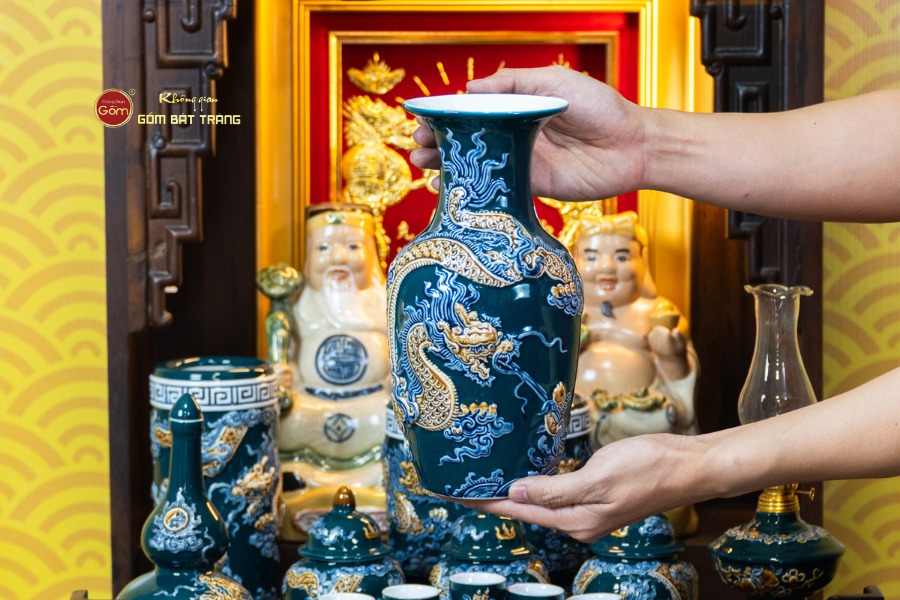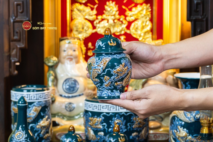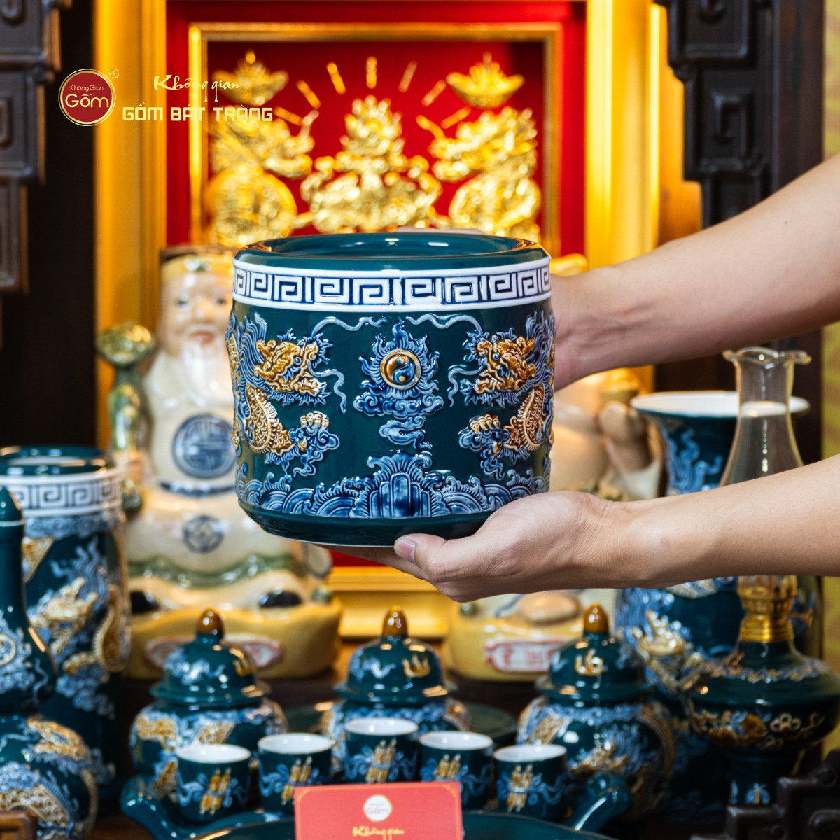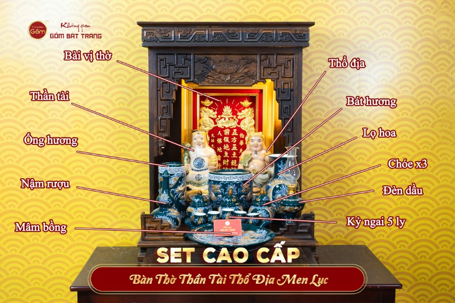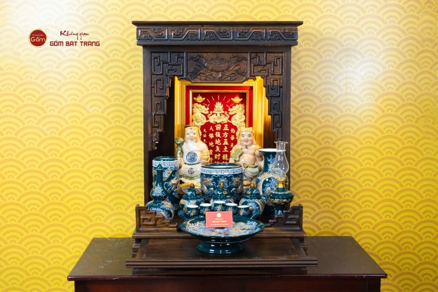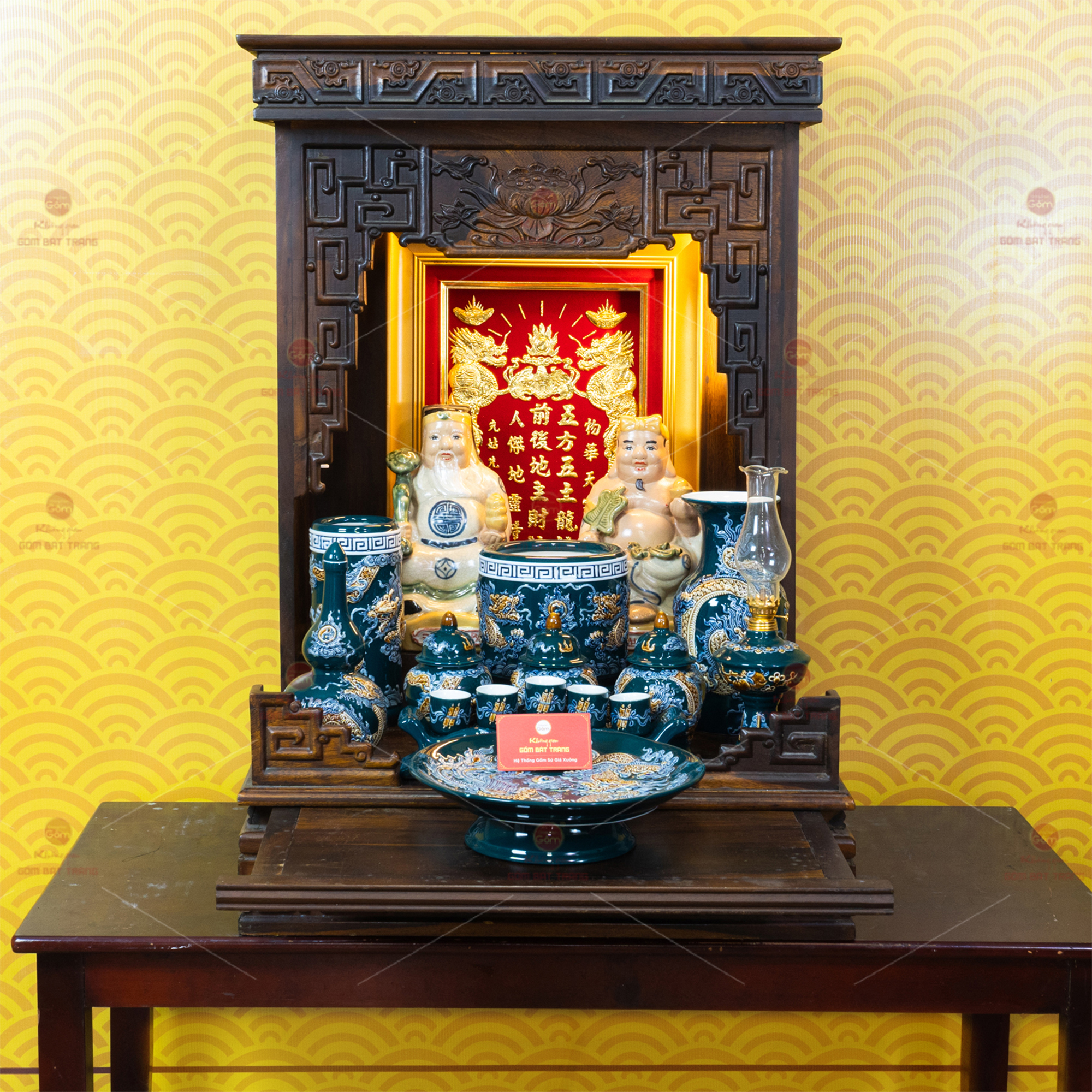 Sắc men lục tạo nên vẻ đẹp trầm mặc, uy nghi và thanh thoát. Trên nền men xanh mát, các họa tiết thường được các nghệ nhân Bát Tràng thực hiện thủ công. Các món đồ trong bộ được thiết kế với kích thước vừa vặn, rất phù hợp với các mẫu bàn thờ Thần Tài tại các cửa hàng nhỏ, văn phòng hoặc căn hộ chung cư. Tỷ lệ giữa các vật phẩm được tính toán cân đối, giúp gia chủ bài trí dễ dàng mà vẫn đảm bảo tính thẩm mỹ cao.