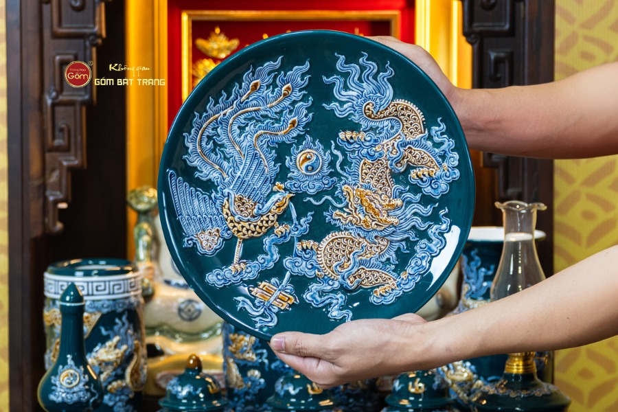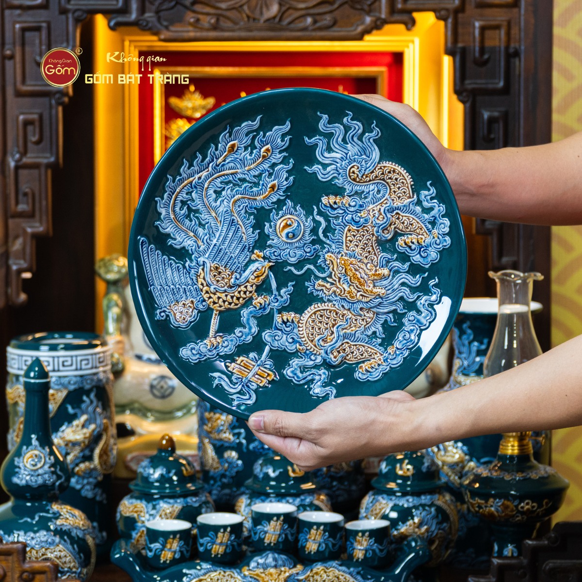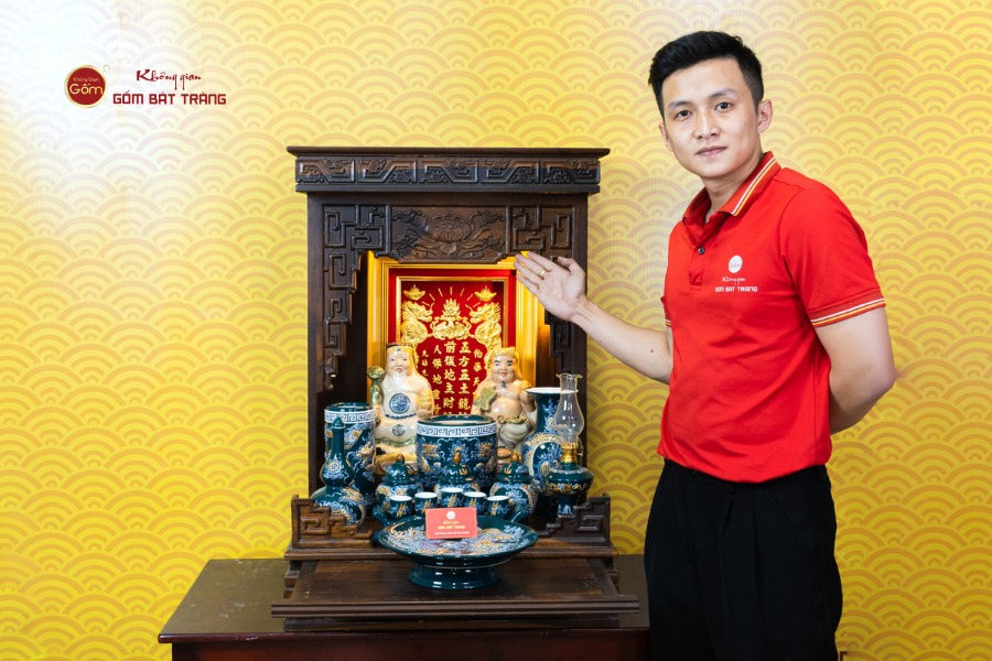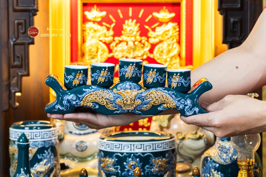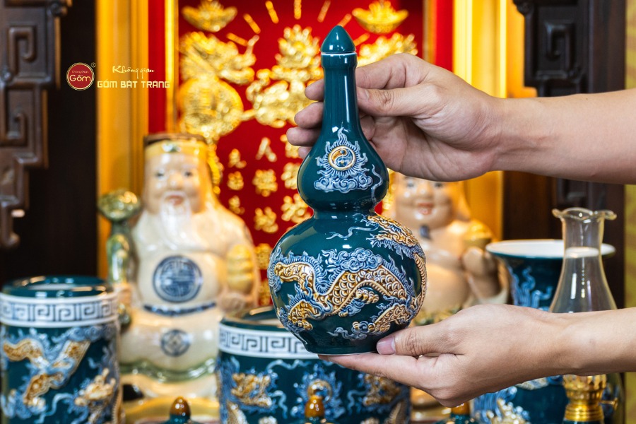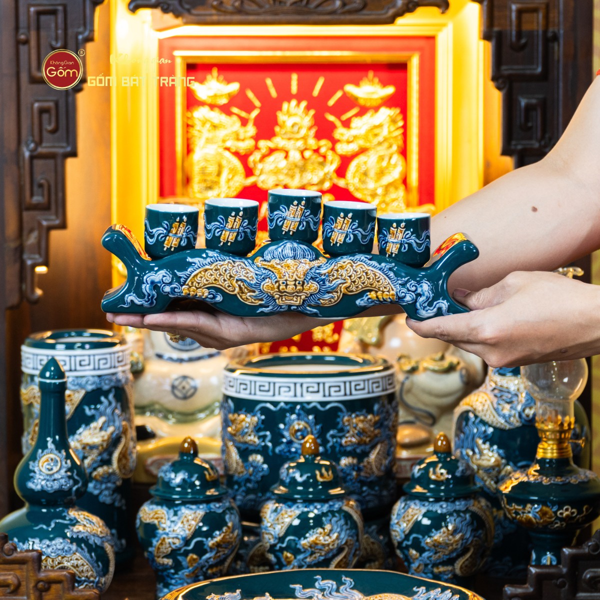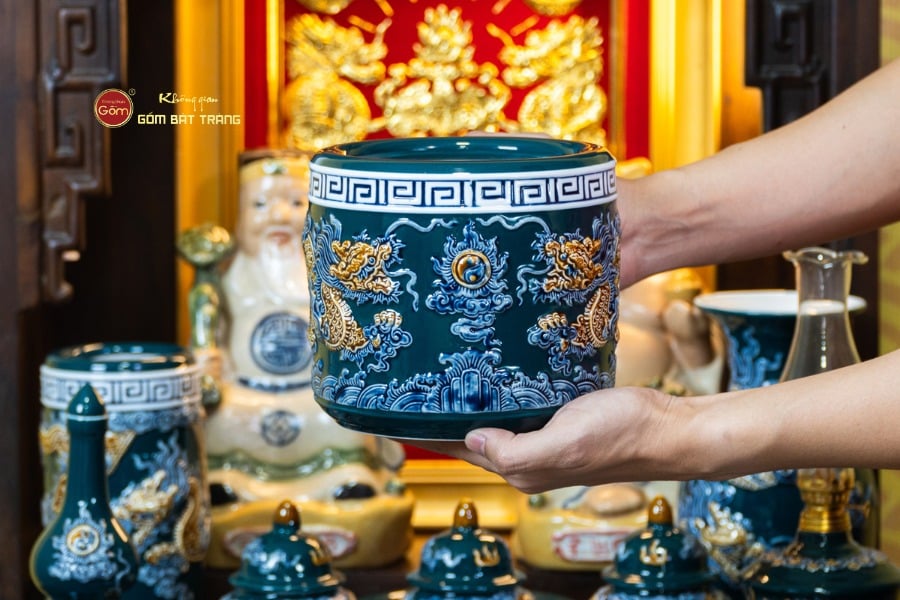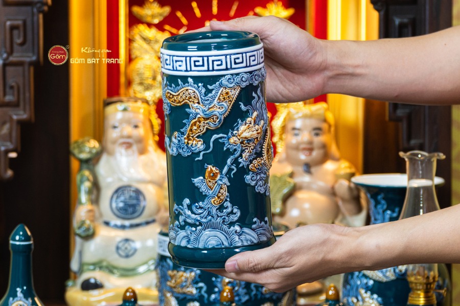Sắc men lục tạo nên vẻ đẹp trầm mặc, uy nghi và thanh thoát. Trên nền men xanh mát, các họa tiết thường được các nghệ nhân Bát Tràng thực hiện thủ công. Các món đồ trong bộ được thiết kế với kích thước vừa vặn, rất phù hợp với các mẫu bàn thờ Thần Tài tại các cửa hàng nhỏ, văn phòng hoặc căn hộ chung cư. Tỷ lệ giữa các vật phẩm được tính toán cân đối, giúp gia chủ bài trí dễ dàng mà vẫn đảm bảo tính thẩm mỹ cao.