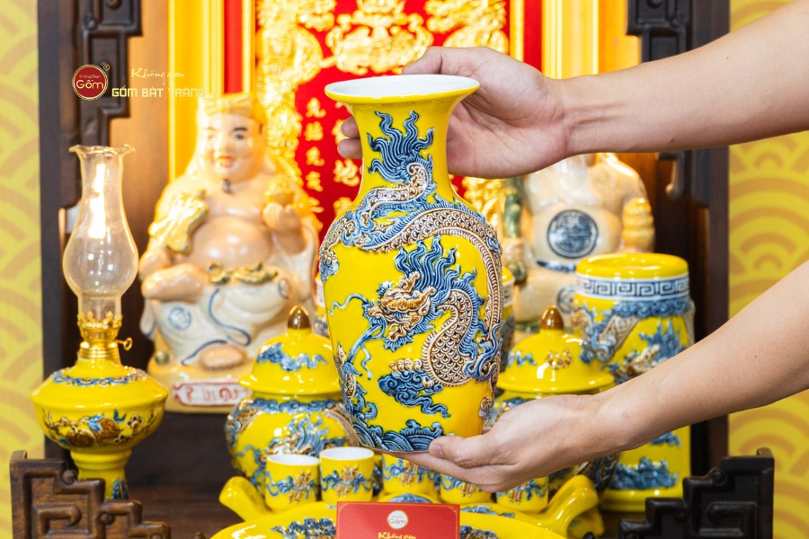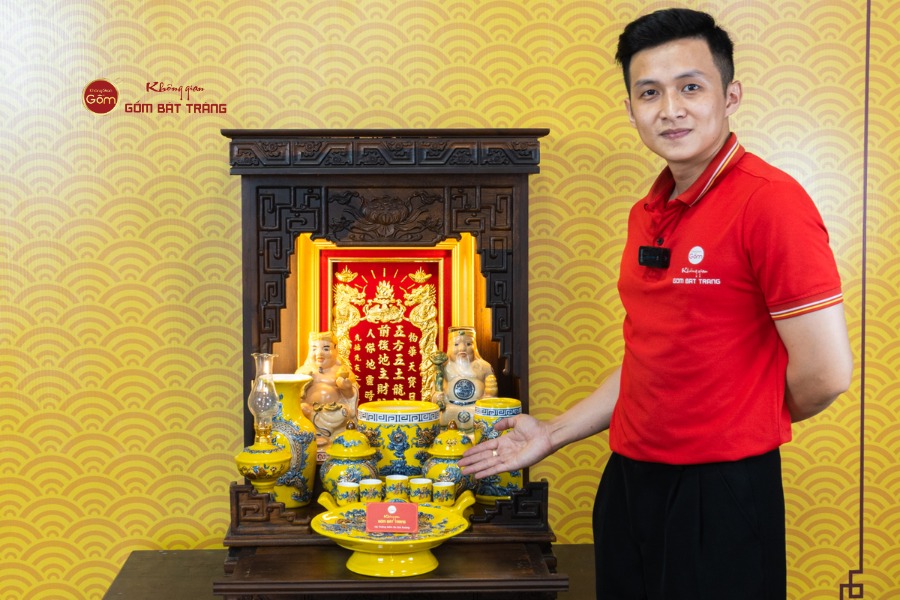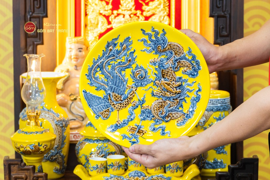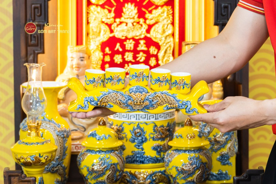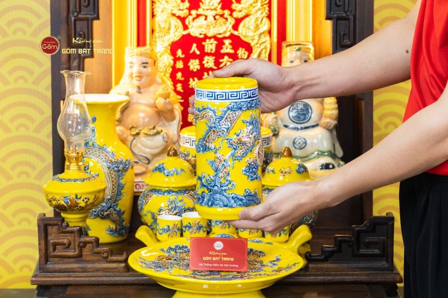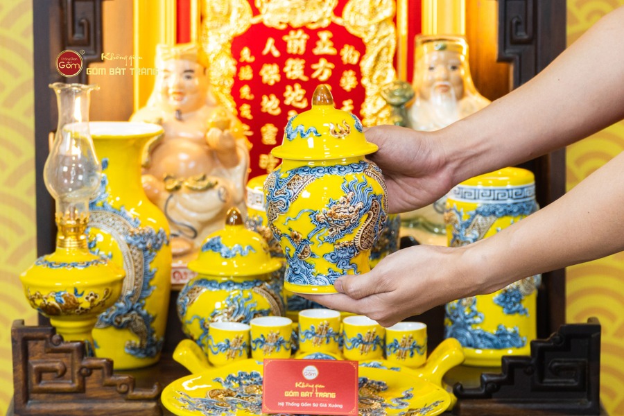 Sự đồng bộ của chín món trong bộ thờ mang lại tổng thể cân đối và liền mạch. Các họa tiết truyền thống được thể hiện rõ nét, có sự liên kết giữa từng vật phẩm, giúp không gian thờ không bị rời rạc khi bài trí. Sắc men vàng khi kết hợp với bàn thờ gỗ tạo nên cảm giác trang nghiêm, vững chãi và hài hòa với nhiều phong cách nội thất từ cổ điển đến hiện đại.