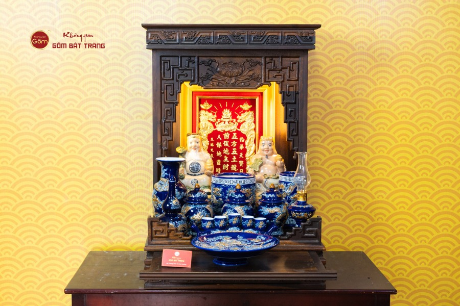 Màu xanh coban tượng trưng cho sự phát triển bền vững và ổn định lâu dài. Bát hương giữ vị trí trung tâm, là nơi hội tụ linh khí và lòng thành của gia chủ mỗi dịp cúng lễ. Tượng Thần Tài – Thổ Địa được đặt trang nghiêm phía sau, đại diện cho tài lộc và sự che chở. Các vật phẩm như kỷ chén, lọ hoa, đĩa thờ và phụ kiện đi kèm giúp hoàn thiện nghi thức dâng lễ, thể hiện sự tôn kính và chu đáo.