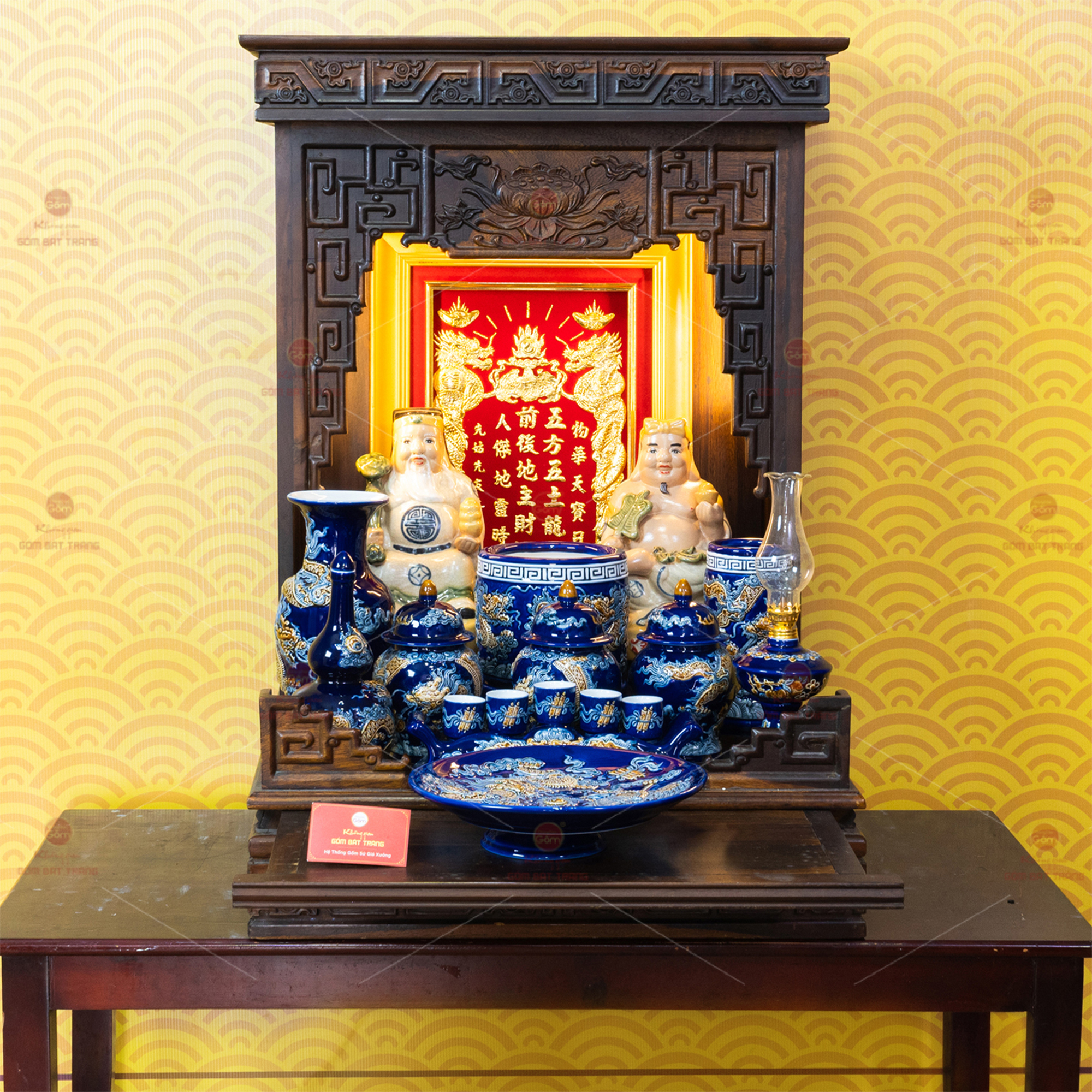 Bộ sản phẩm không kèm bàn thờ gỗ. Quý khách có thể tham khảo thêm các sản phẩm bàn thờ gỗ phù hợp hoặc liên hệ để được tư vấn thêm.