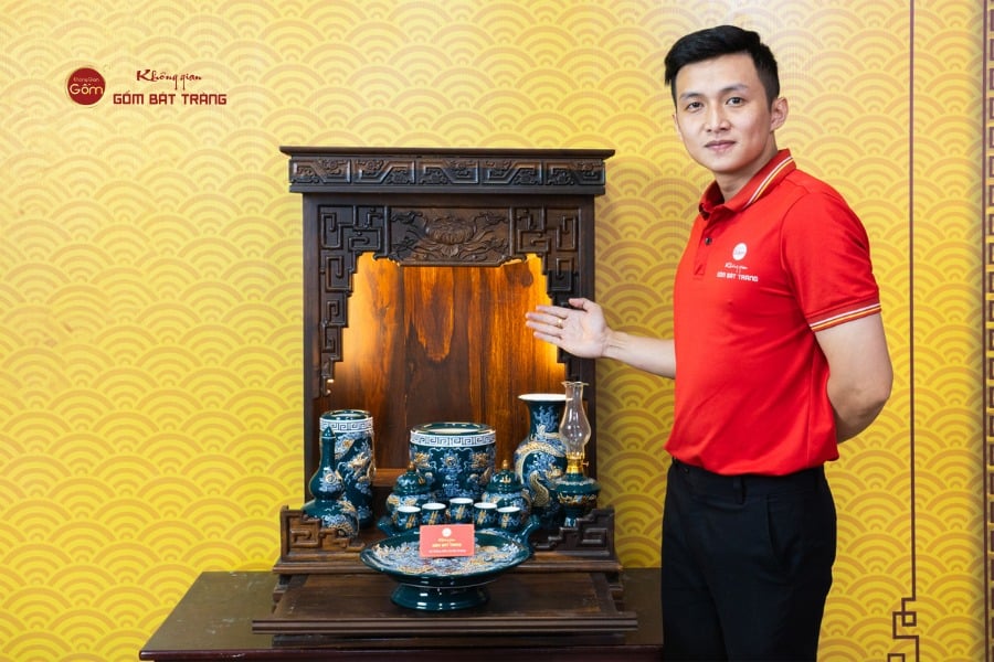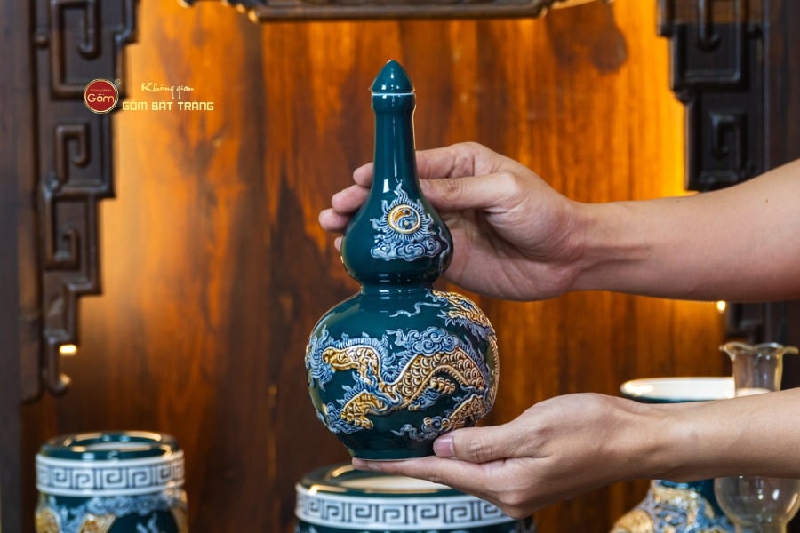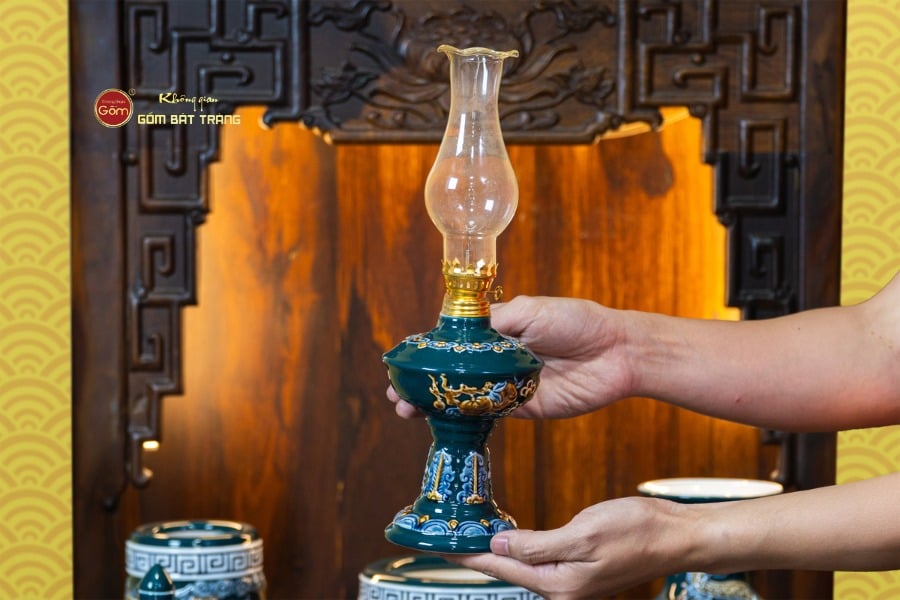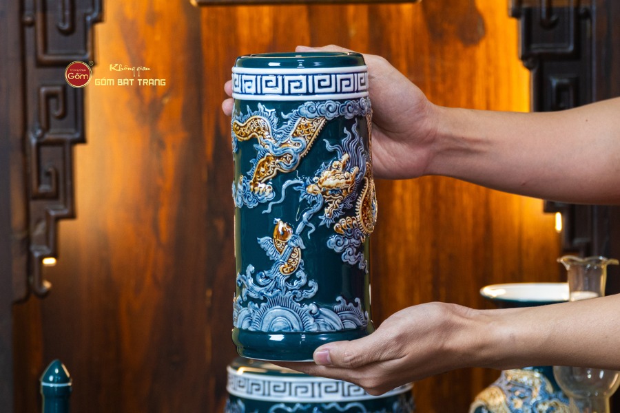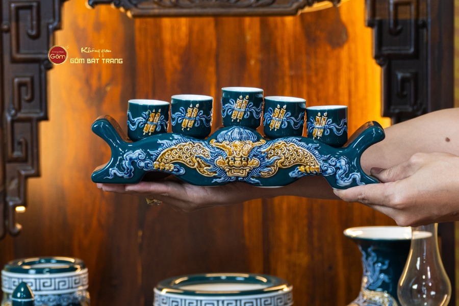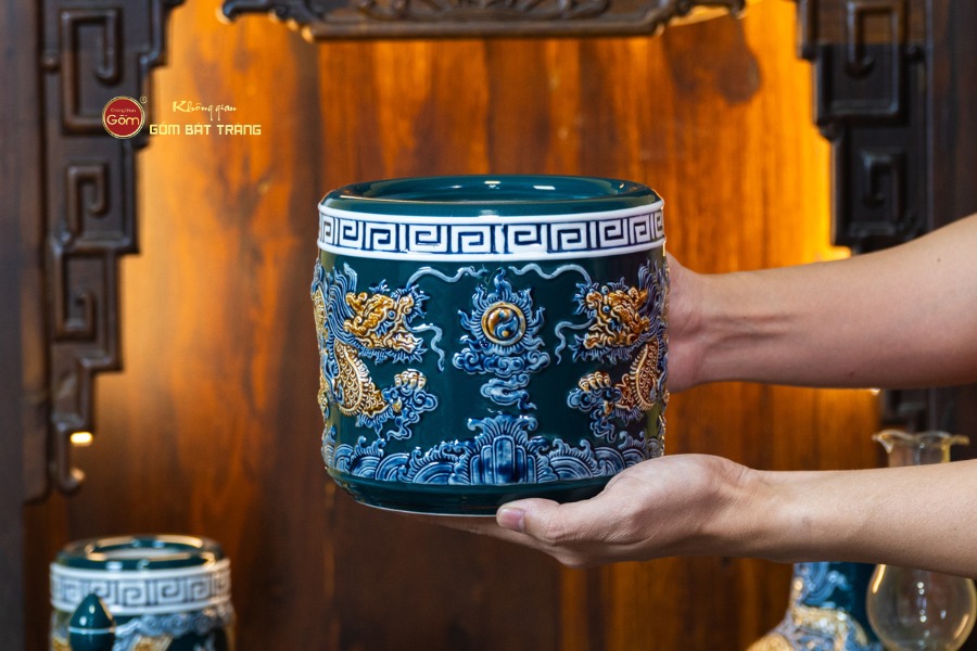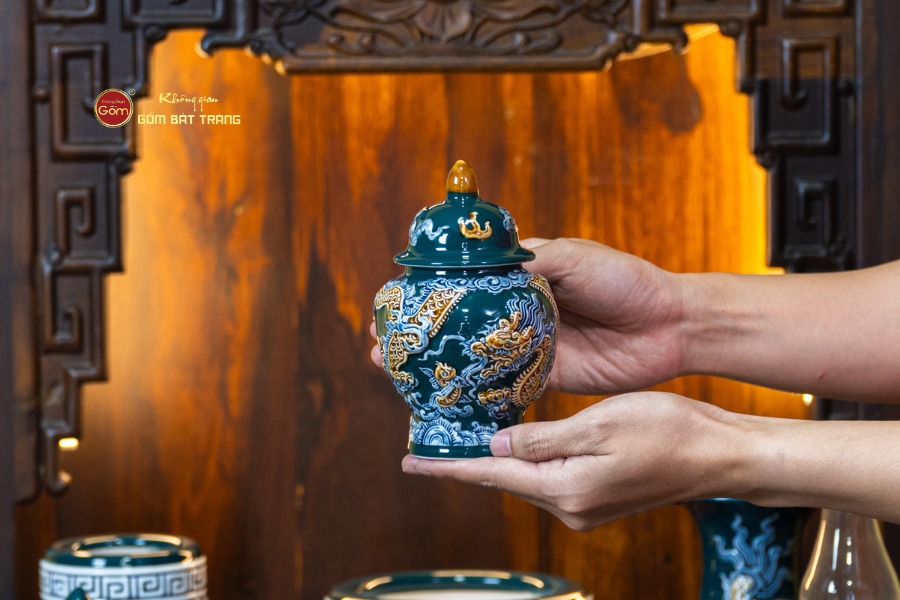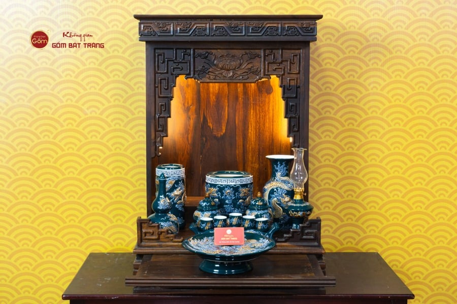 Sắc men lục tạo nên vẻ đẹp trầm mặc, uy nghi và thanh thoát. Trên nền men xanh mát, các họa tiết thường được các nghệ nhân Bát Tràng thực hiện thủ công. Các món đồ trong bộ được thiết kế với kích thước vừa vặn, rất phù hợp với các mẫu bàn thờ Thần Tài tại các cửa hàng nhỏ, văn phòng hoặc căn hộ chung cư. Tỷ lệ giữa các vật phẩm được tính toán cân đối, giúp gia chủ bài trí dễ dàng mà vẫn đảm bảo tính thẩm mỹ cao.