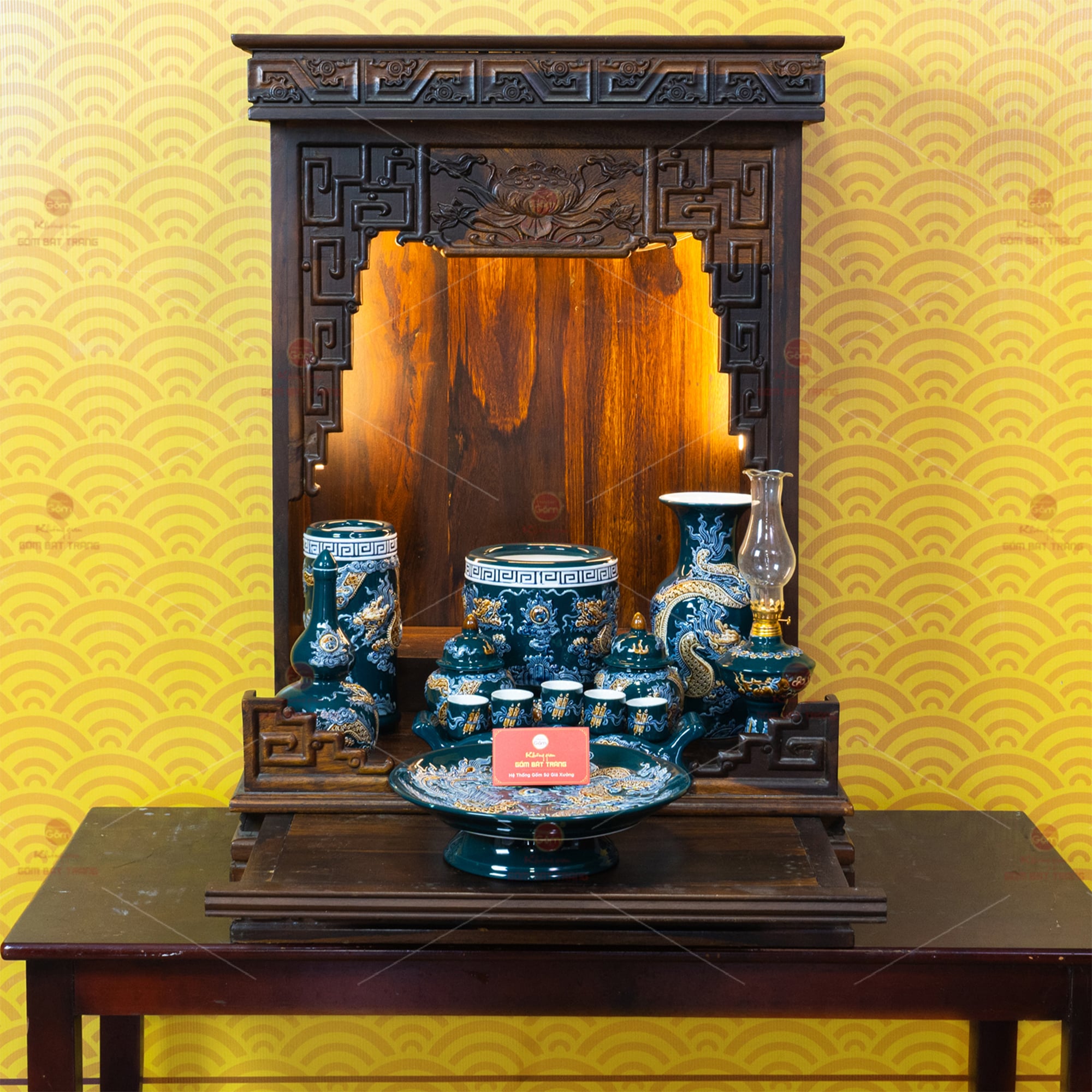Bộ sản phẩm không kèm bàn thờ gỗ. Quý khách có thể tham khảo thêm các sản phẩm bàn thờ gỗ phù hợp hoặc liên hệ để được tư vấn thêm.