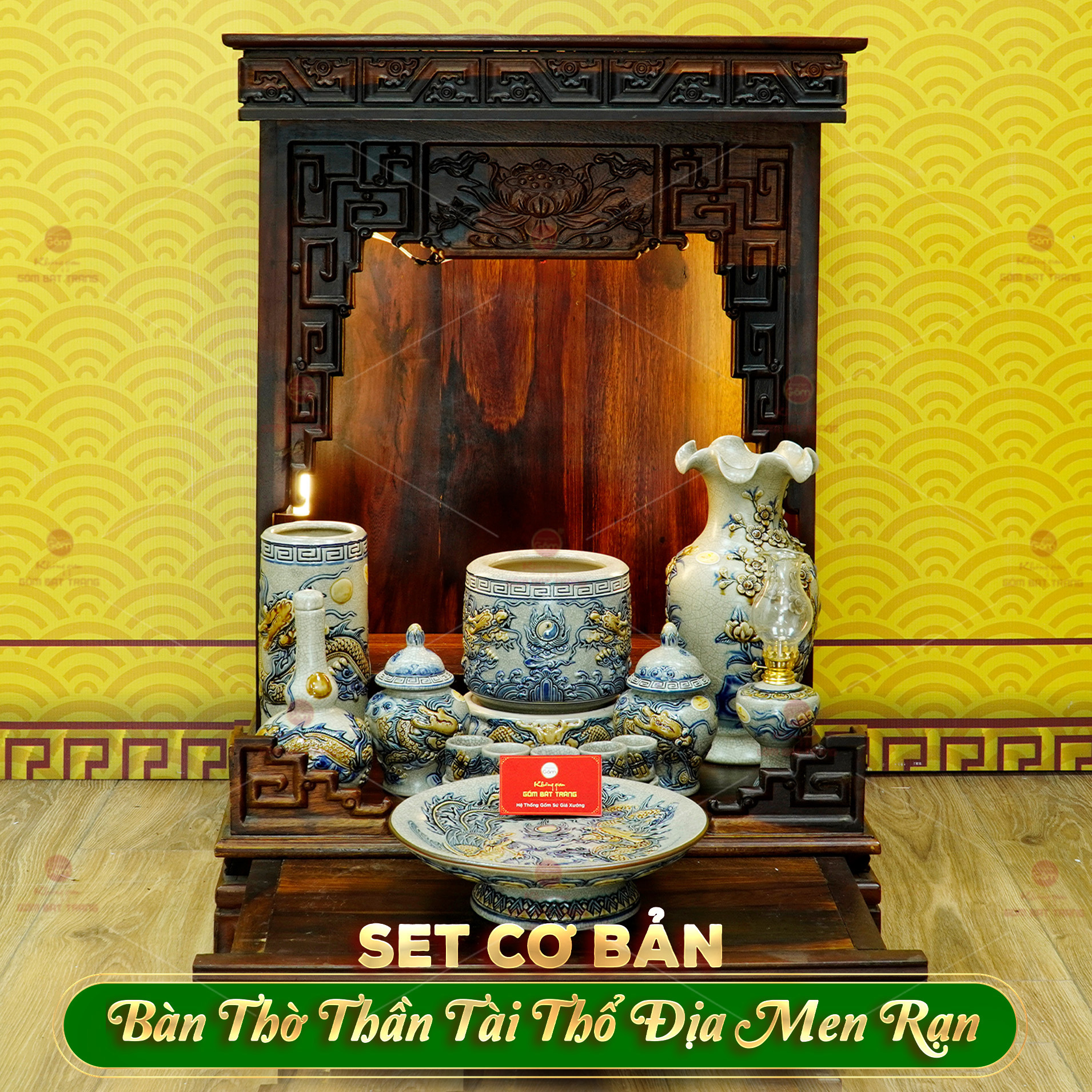 Set cơ bản gồm 9 món đầy đủ: bát hương và đế, mâm bồng, lọ hoa, đèn dầu, chân nến, kỷ chén, ống hương, ống đũa và đĩa quả. Toàn bộ được chế tác thủ công tại làng gốm Bát Tràng, đảm bảo tỷ lệ chuẩn, kiểu dáng cân đối và thuận tiện khi bày trí trên bàn thờ Thần Tài – Thổ Địa trong gia đình hoặc cửa hàng.