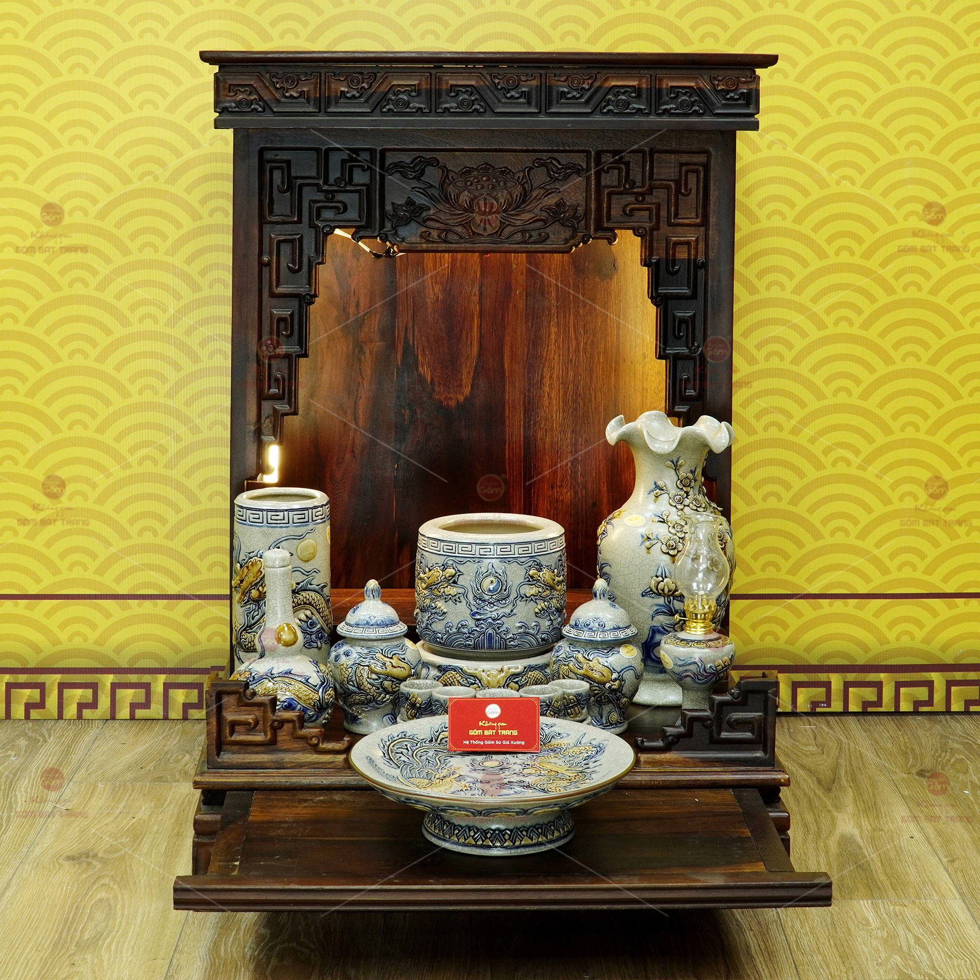 Điểm nổi bật của bộ sản phẩm nằm ở nước men rạn cổ truyền – sắc men xám ngà đặc trưng, bề mặt rạn tự nhiên như vân ngọc, gợi cảm giác cổ kính, trầm mặc và linh thiêng. Trên nền men rạn, họa tiết rồng, mây, hoa sen, chữ Phúc – Lộc – Thọ được vẽ tay tỉ mỉ bằng men lam hoặc men vàng, tạo nên vẻ đẹp vừa sang trọng vừa gần gũi, phản chiếu tinh thần tín ngưỡng dân gian qua bàn tay tài hoa của nghệ nhân Bát Tràng.