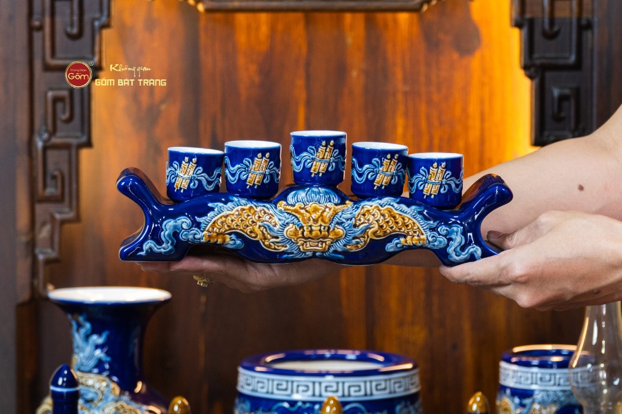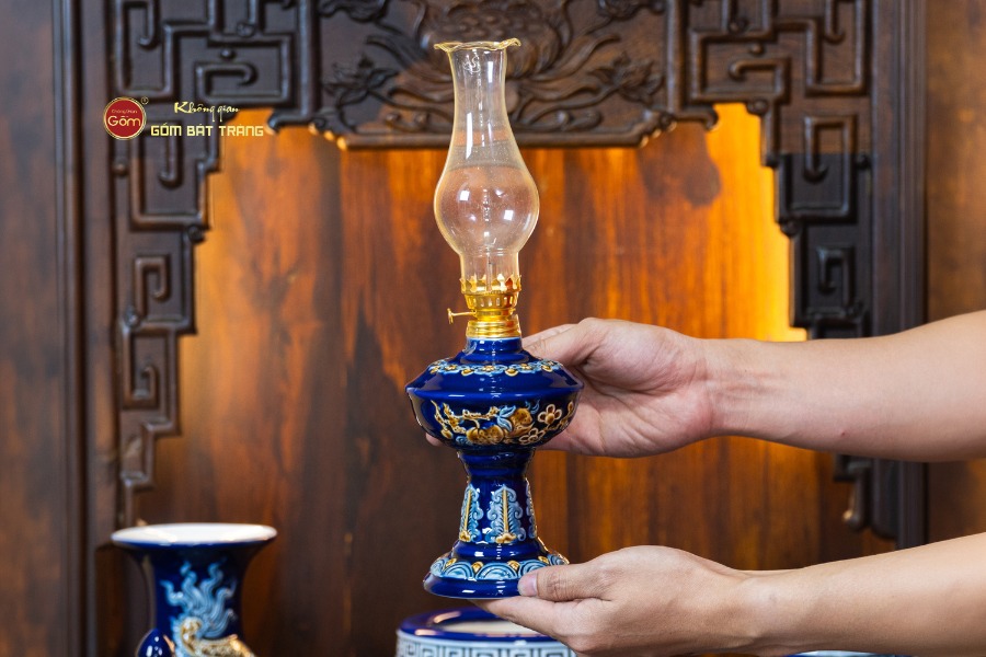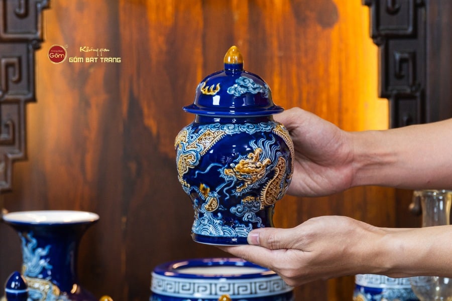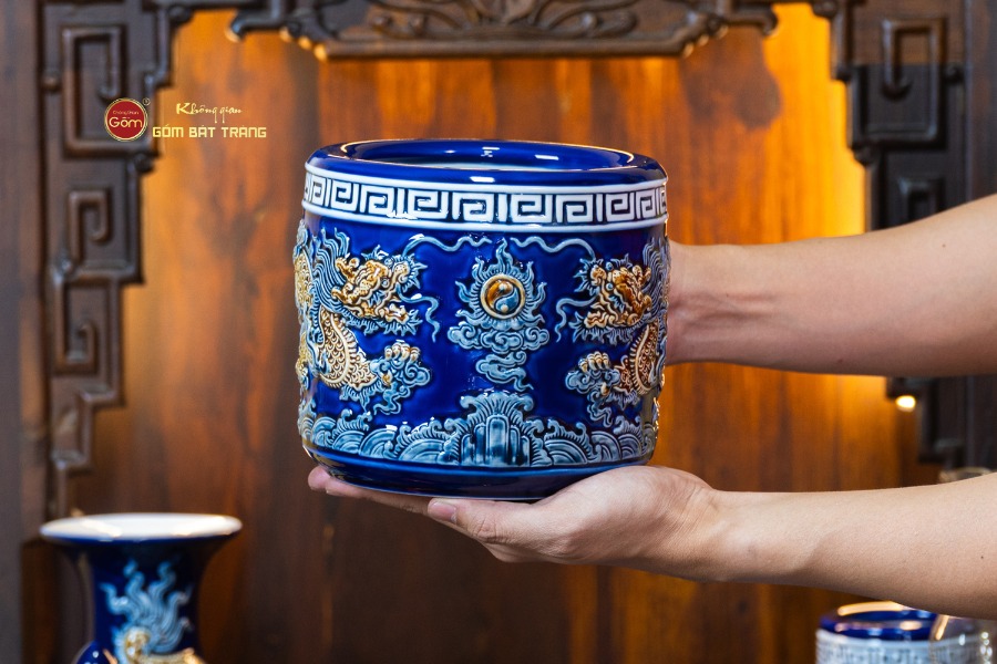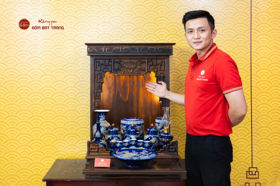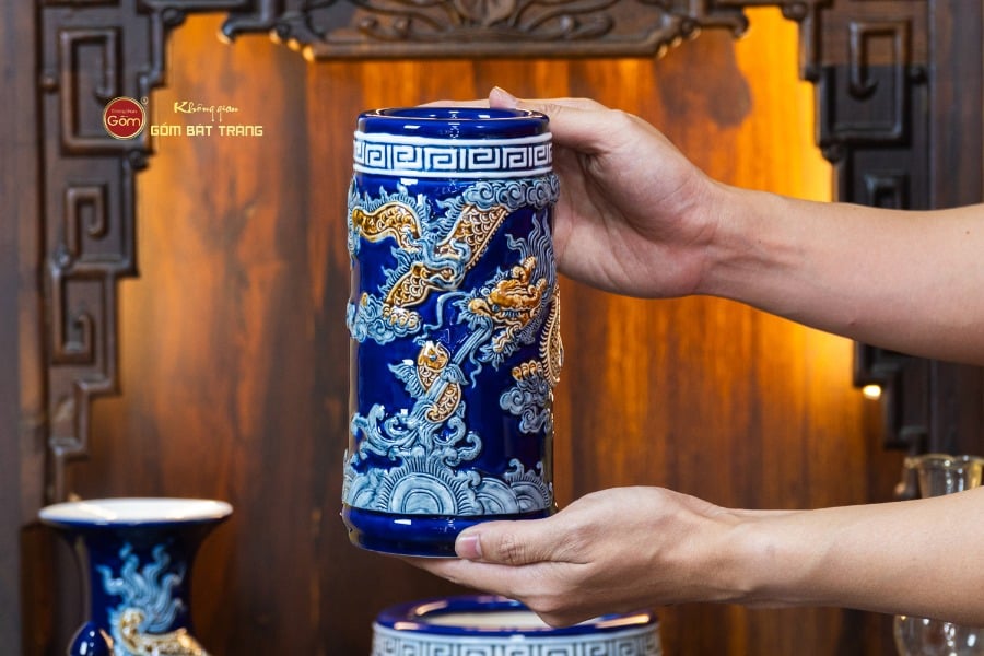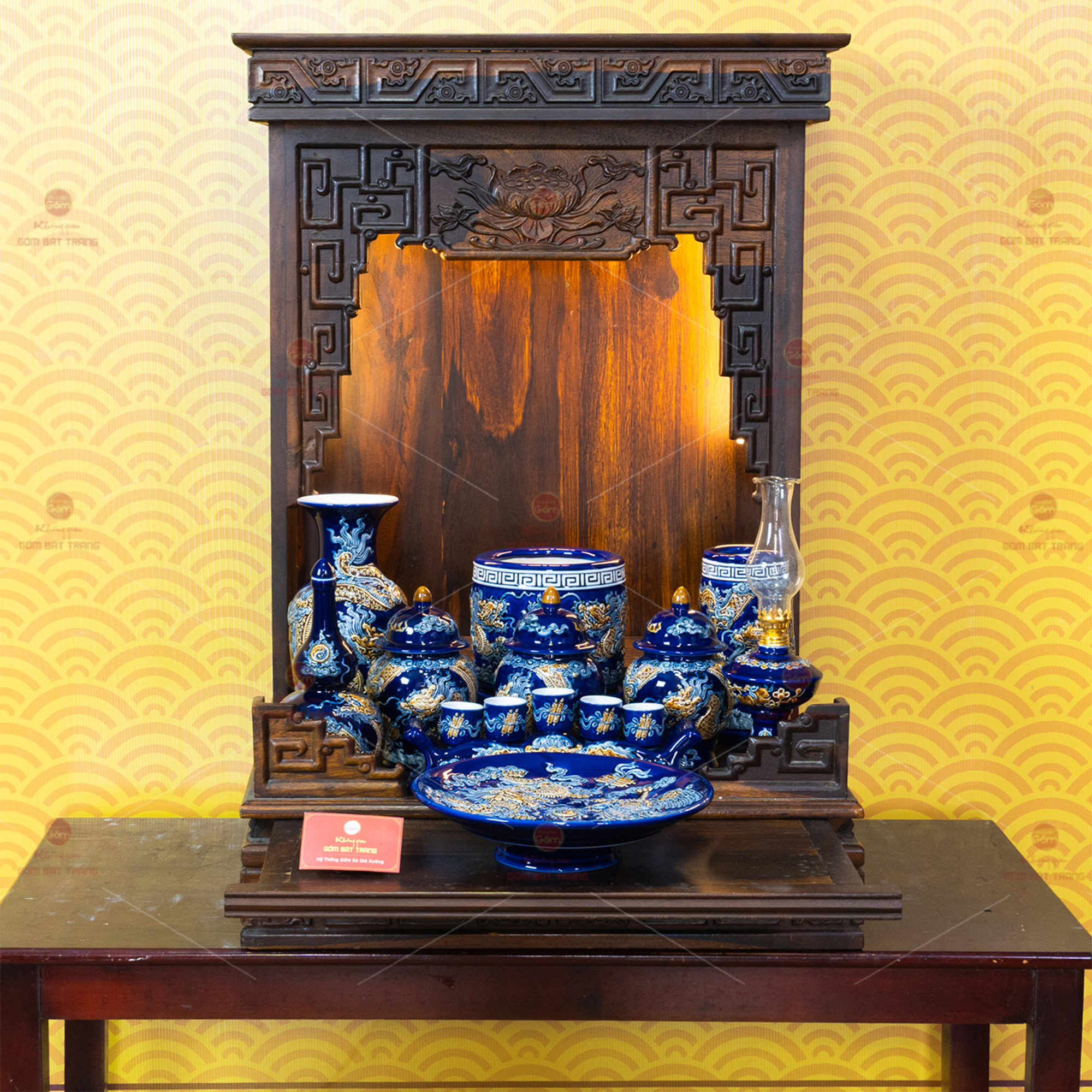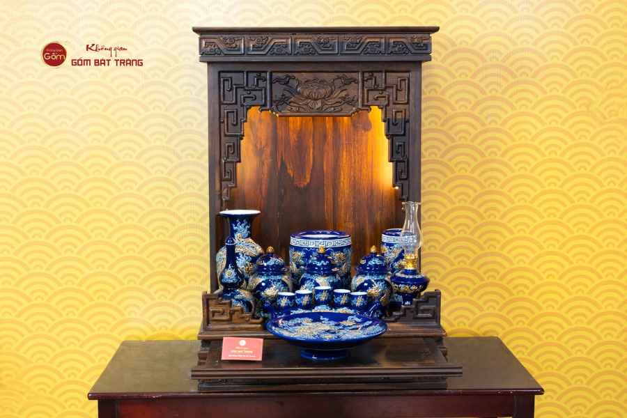 Sự đồng bộ của chín món trong bộ thờ mang lại tổng thể cân đối và liền mạch. Các họa tiết truyền thống được thể hiện rõ nét, có sự liên kết giữa từng vật phẩm, giúp không gian thờ không bị rời rạc khi bài trí. Sắc xanh coban khi kết hợp với bàn thờ gỗ tạo nên cảm giác trang nghiêm, vững chãi và hài hòa với nhiều phong cách nội thất từ cổ điển đến hiện đại.