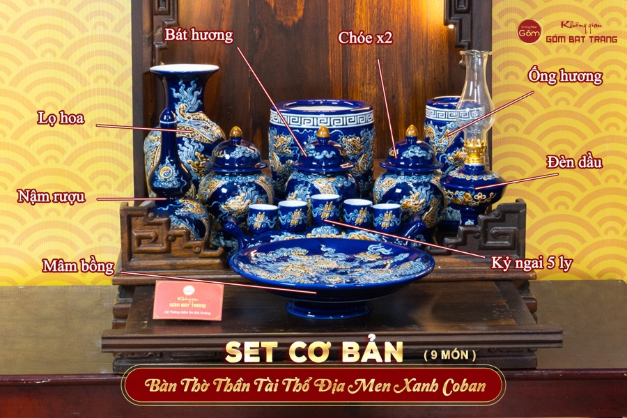 Ý nghĩa Bộ Đồ Thờ Thần Tài Thổ Địa (Cơ Bản 9 Món) Men Xanh Coban
