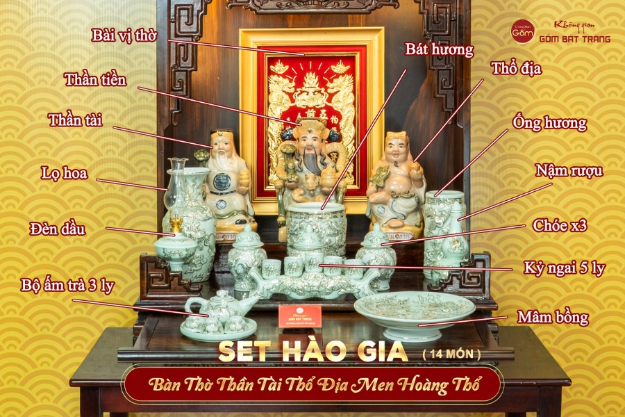 Bộ đồ thờ Thần Tài được thiết kế trọn bộ bao gồm đầy đủ 14 món cần thiết cho việc thờ cúng Thần Tài Thổ Địa theo nghi lễ truyền thống. Tất cả các món đồ đều được thiết kế hài hòa về kích thước và phong cách, tạo nên một tổng thể hài hòa. Toàn bộ bộ đồ thờ được chế tác từ đất sét tinh luyện, trải qua quá trình nung ở nhiệt độ cao trên 1200°C. Điều này giúp sản phẩm có độ bền cực cao, xương gốm đanh chắc và lớp men không bị xỉn màu hay rạn nứt trước các tác động của môi trường.