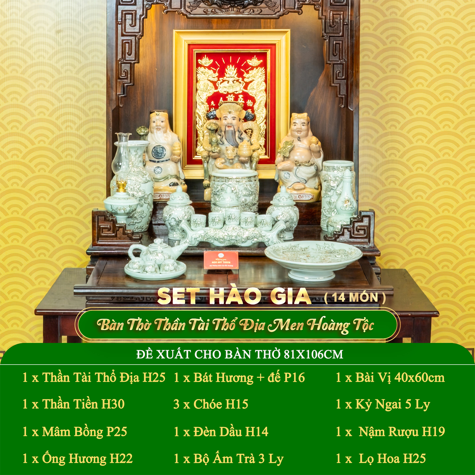 Bộ Đồ Thờ Thần Tài Thổ Địa (Hào Gia 14 Món) Men Hoàng Tộc Vẽ Vàng