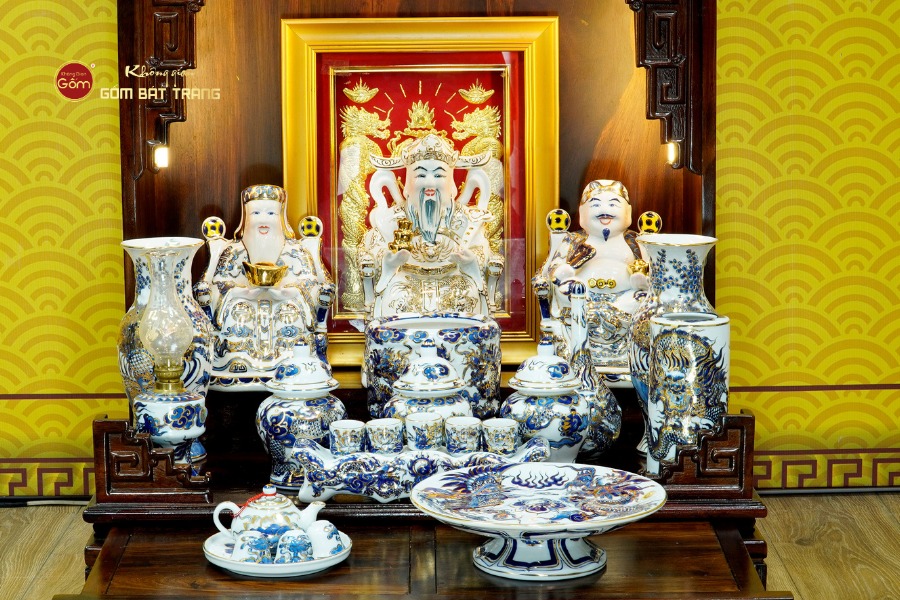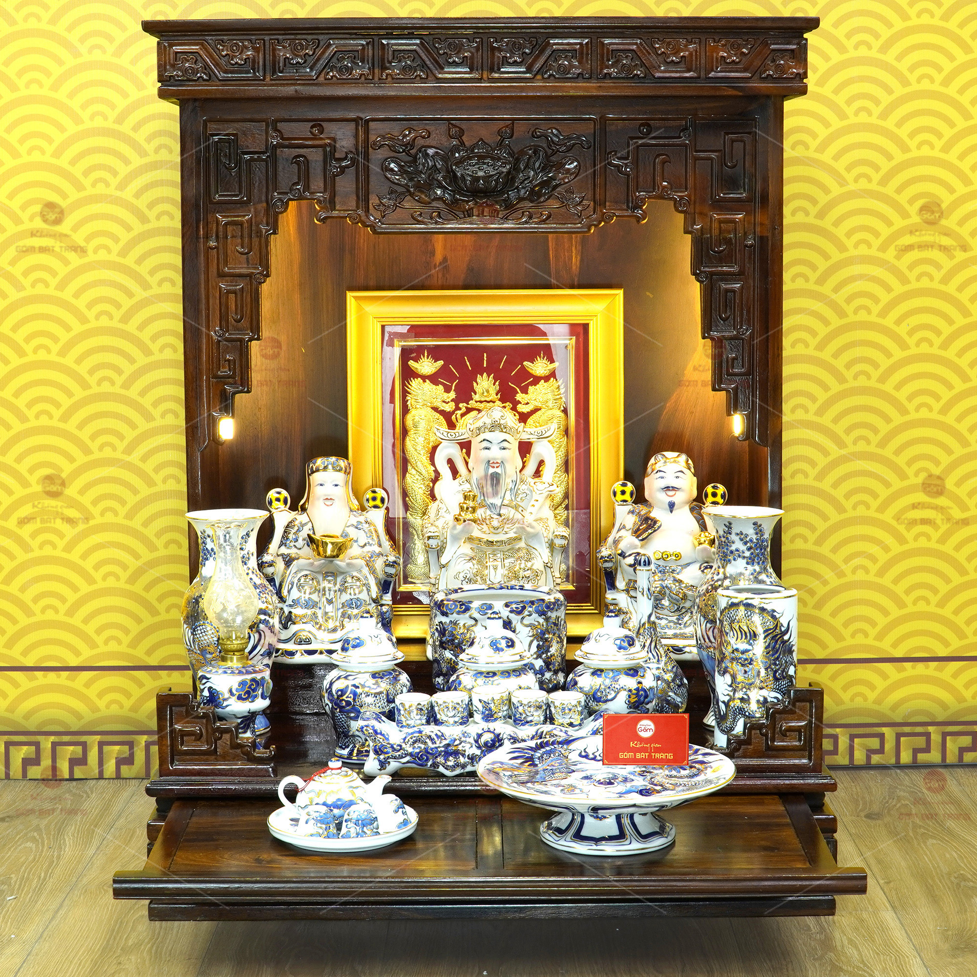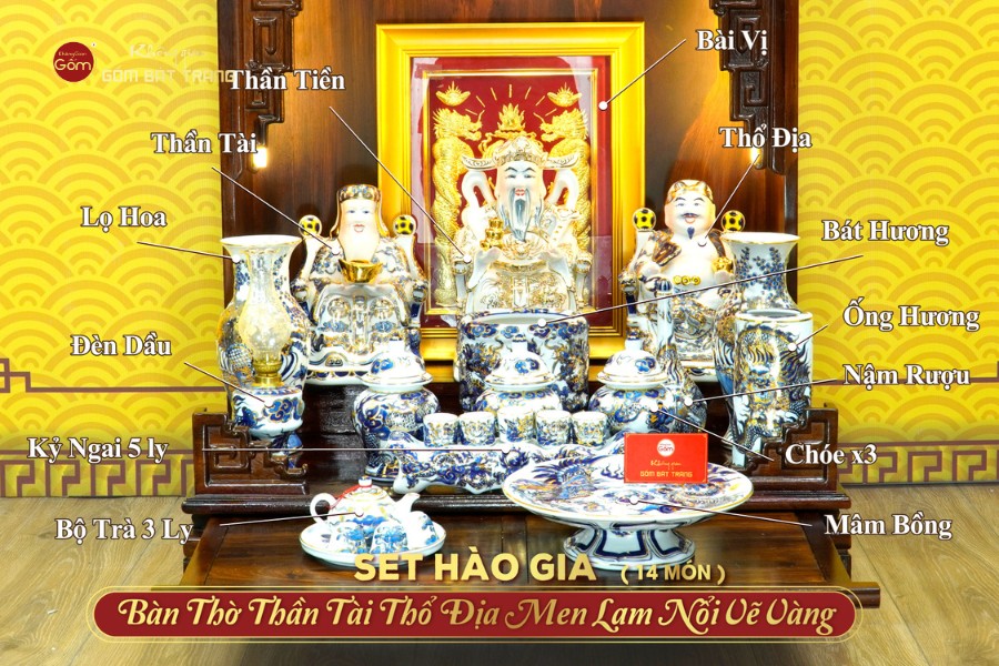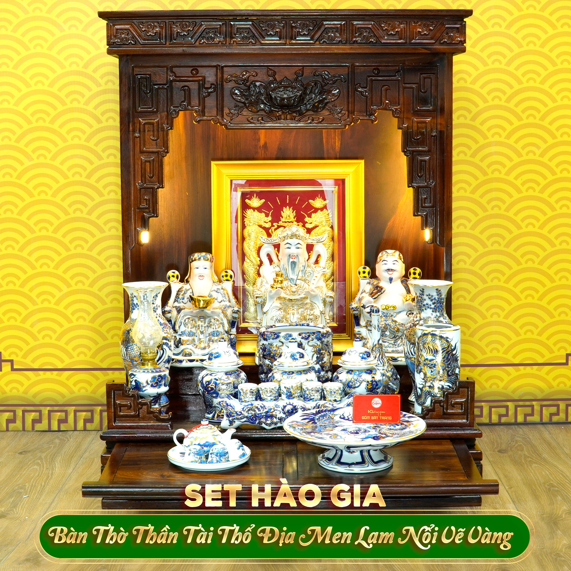 Giá trị thẩm mỹ và phong thủy [Set Hào Gia] Bộ Đồ Thờ Thần Tài Thổ Địa (Hào Gia 14 Món) Men Lam Nổi Vẽ Vàng