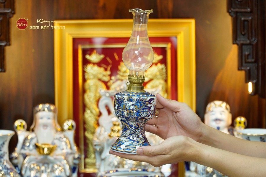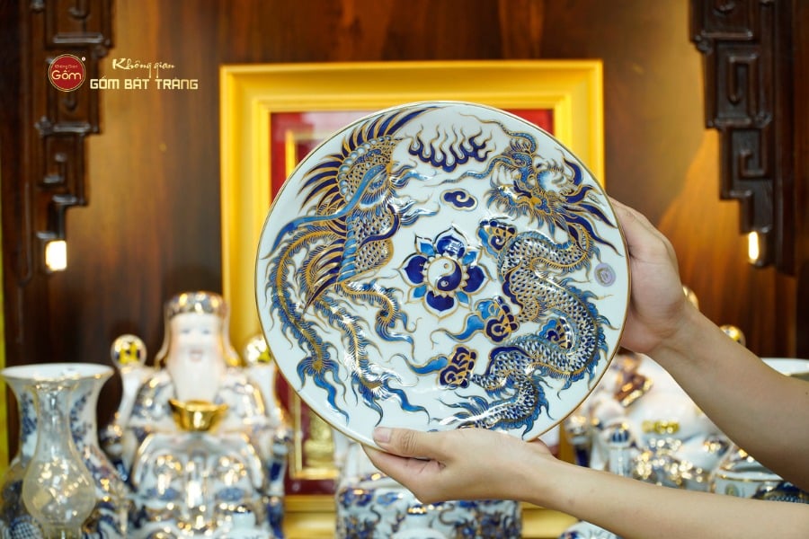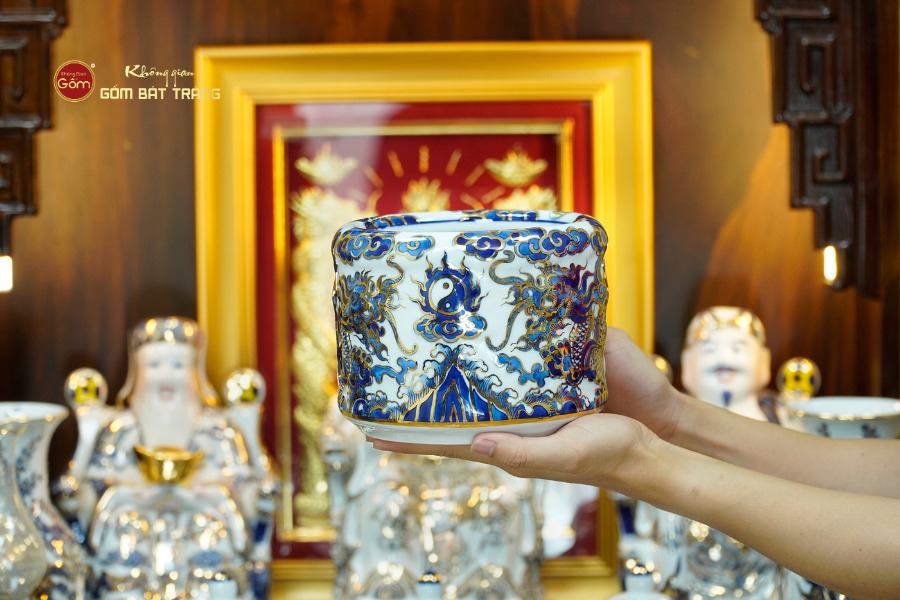 Đặc biệt, men lam nổi vẽ vàng mang ý nghĩa vừa cổ điển vừa linh thiêng – lam là sắc của sự tĩnh tại, trí tuệ, còn vàng là biểu tượng của phú quý và thịnh vượng. Sự kết hợp này giúp kích hoạt năng lượng tài lộc, bảo hộ cho công việc và cuộc sống của gia chủ luôn thuận lợi, hanh thông.