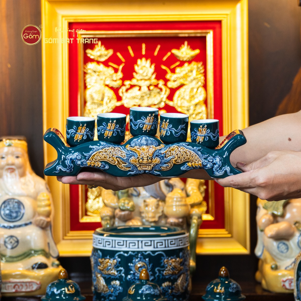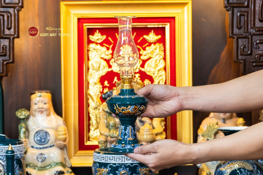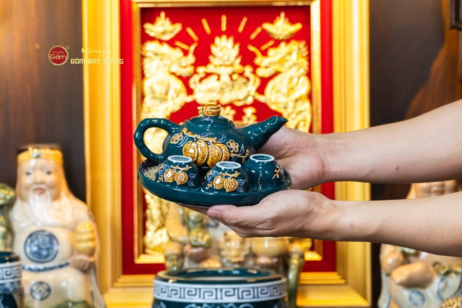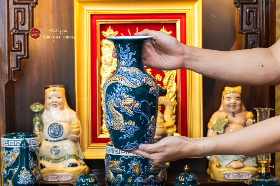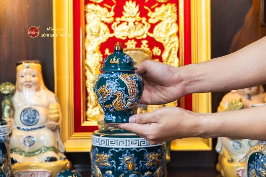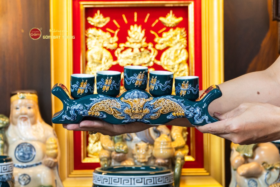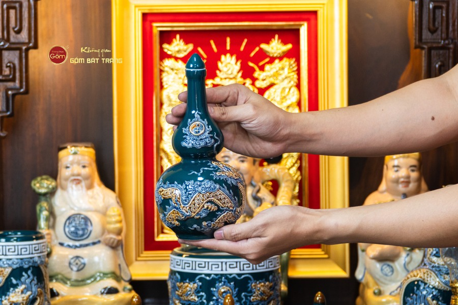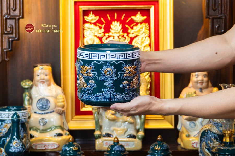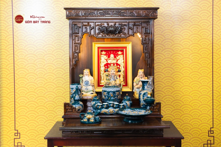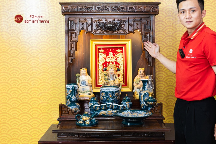 Sắc men lục tạo nên vẻ đẹp trầm mặc, uy nghi và thanh thoát. Trên nền men xanh mát, các họa tiết thường được các nghệ nhân Bát Tràng thực hiện thủ công. Các món đồ trong bộ được thiết kế với kích thước vừa vặn, rất phù hợp với các mẫu bàn thờ Thần Tài tại các cửa hàng nhỏ, văn phòng hoặc căn hộ chung cư. Tỷ lệ giữa các vật phẩm được tính toán cân đối, giúp gia chủ bài trí dễ dàng mà vẫn đảm bảo tính thẩm mỹ cao.
