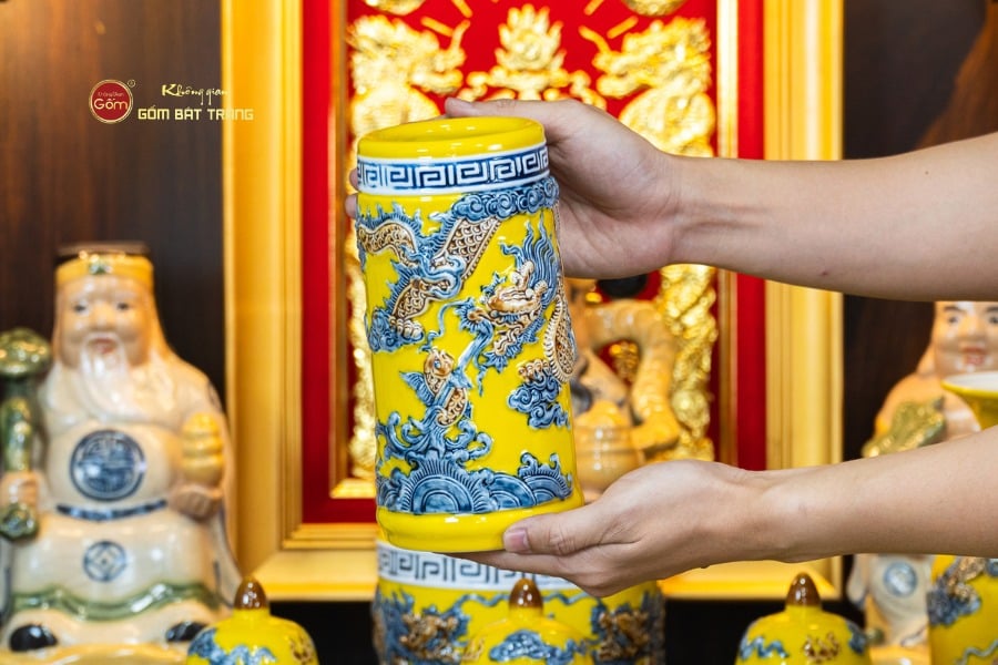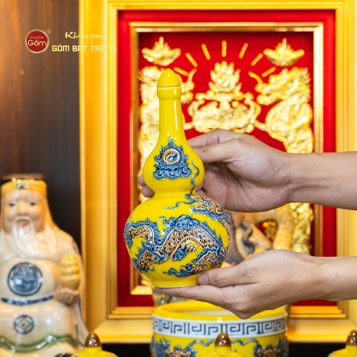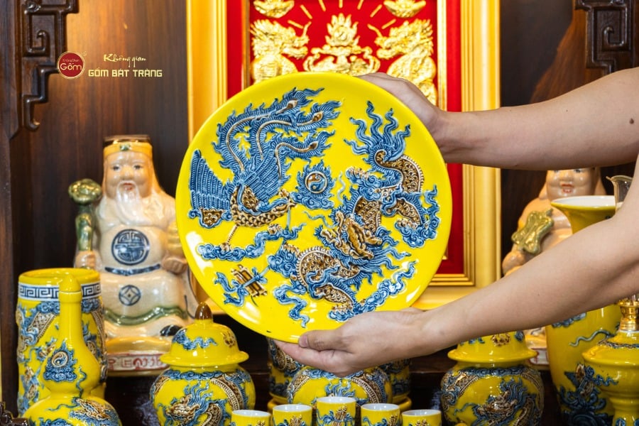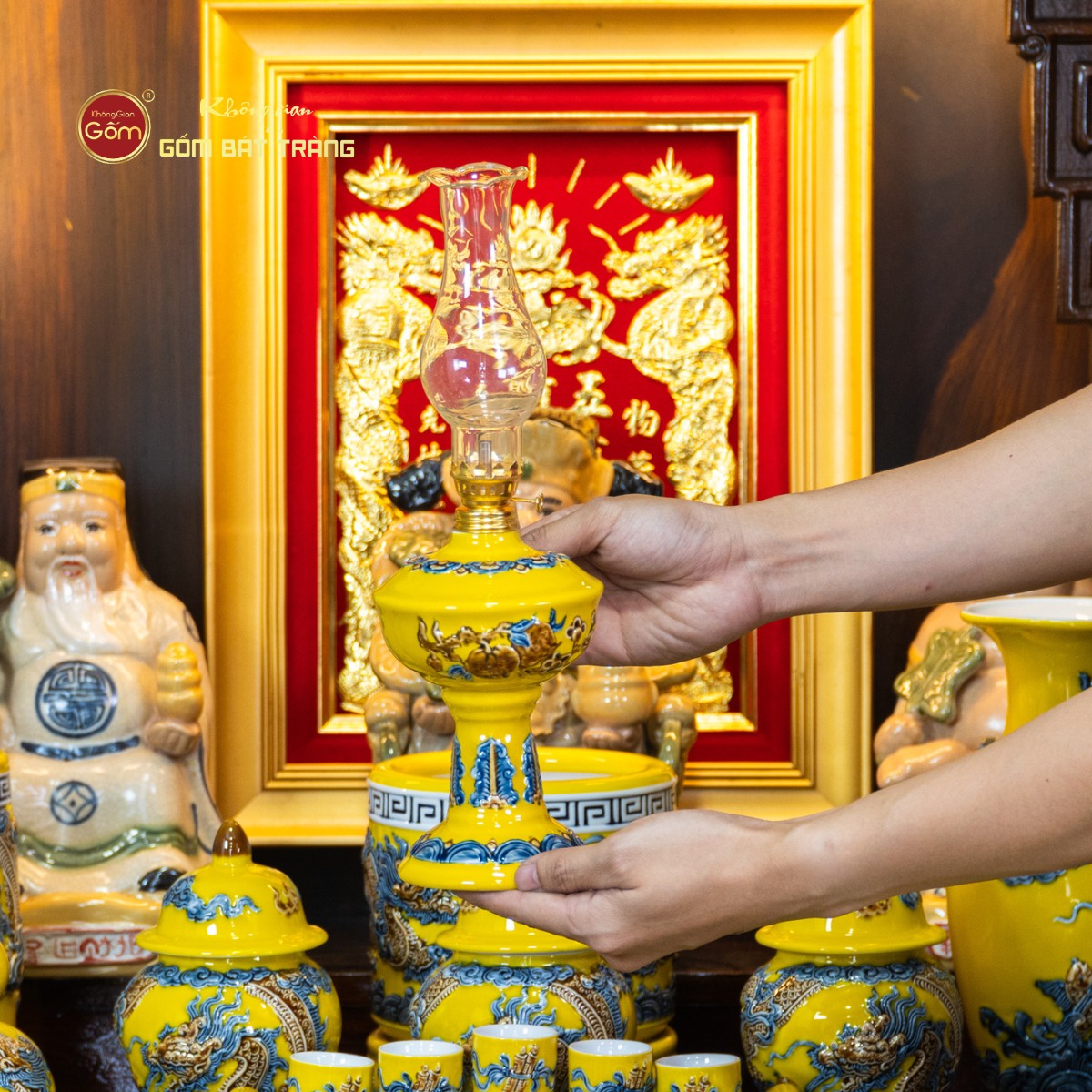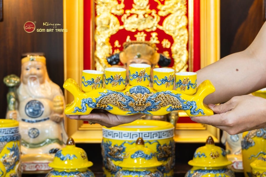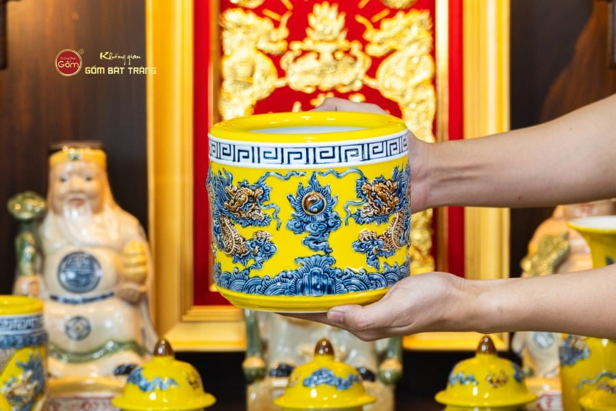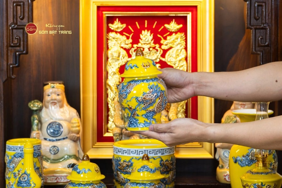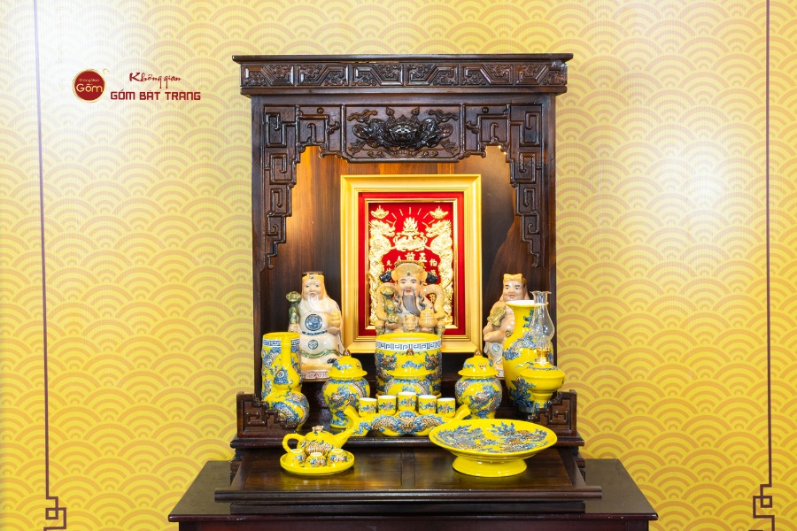 Sự đồng bộ của chín món trong bộ thờ mang lại tổng thể cân đối và liền mạch. Các họa tiết truyền thống được thể hiện rõ nét, có sự liên kết giữa từng vật phẩm, giúp không gian thờ không bị rời rạc khi bài trí. Sắc men vàng khi kết hợp với bàn thờ gỗ tạo nên cảm giác trang nghiêm, vững chãi và hài hòa với nhiều phong cách nội thất từ cổ điển đến hiện đại.