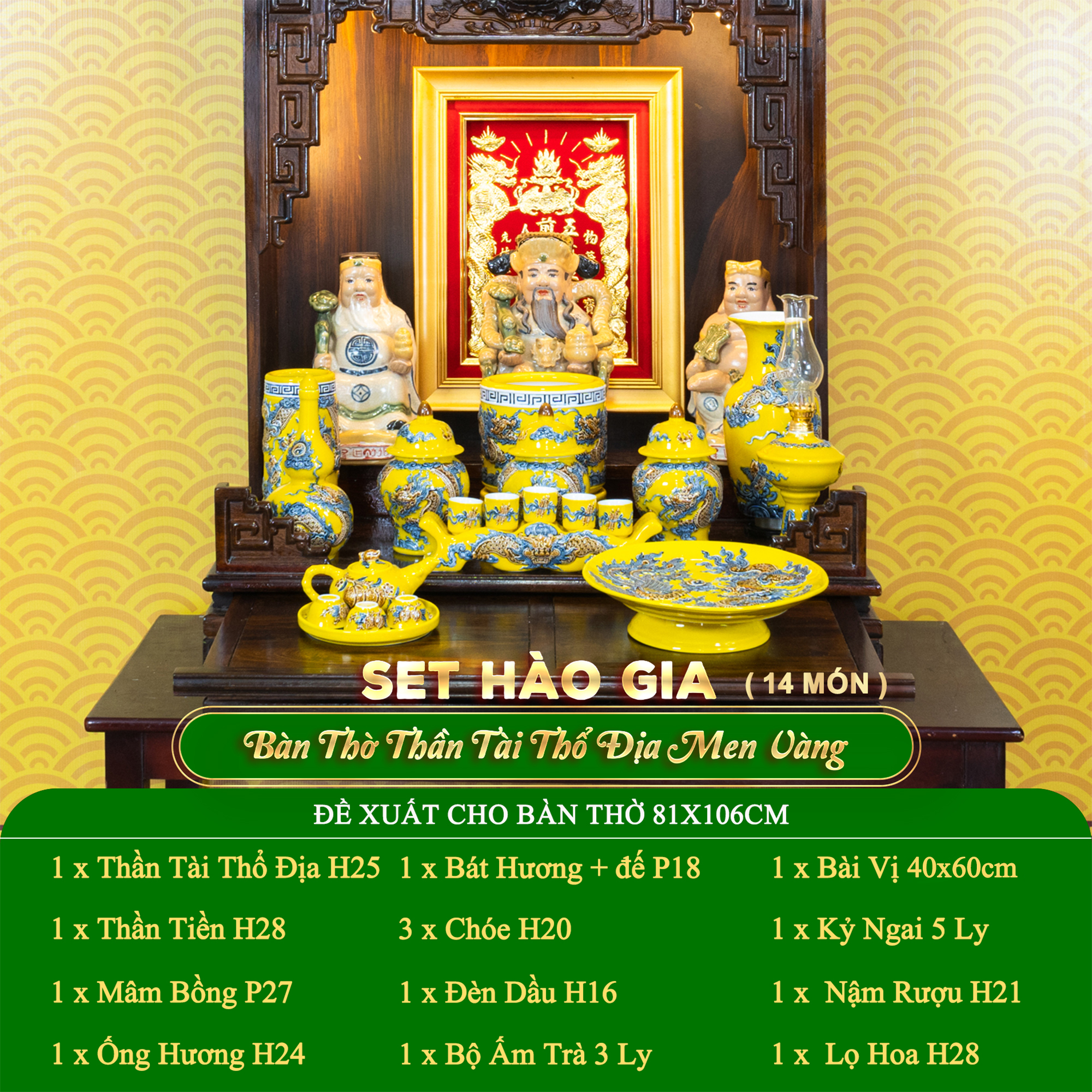 | Tên sản phẩm: | Bộ Đồ Thờ Thần Tài Thổ Địa (Hào Gia 14 Món) Men Vàng |